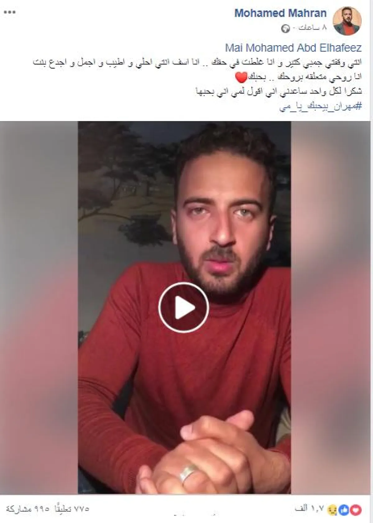 وتابع قائلا: مش عيب أن الواحد يعترف بغلطته، وأنا مكنتش بعمل كدة للأسف، وبقولها صراحة أنا آسف يا مي، وأنا بجد بحبك، وانت أحلى حاجة حصلت في حياتي، وأنا مش بعمل الفيديو ده علشان الناس تفتكر إني رقيق أو رومانسي، وإنما لأني أريد الاعتراف بغلطتي في حق أهم إنسانة في حياتي أمام الجميع، وأريد من الناس كلها أن تساعدني لتعرفي أني بحبك.