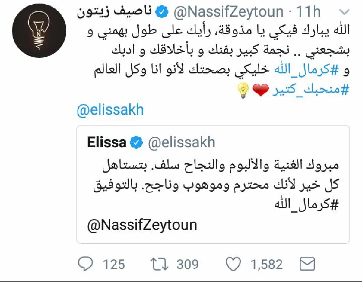 إليسا باركت لــ ناصيف نجاح أغنية "كرمال الله" وتوقعت نجاح الألبوم بشكل مسبق، وأكدت أنه يستحقه لأنه محترم وموهوب وناجح.