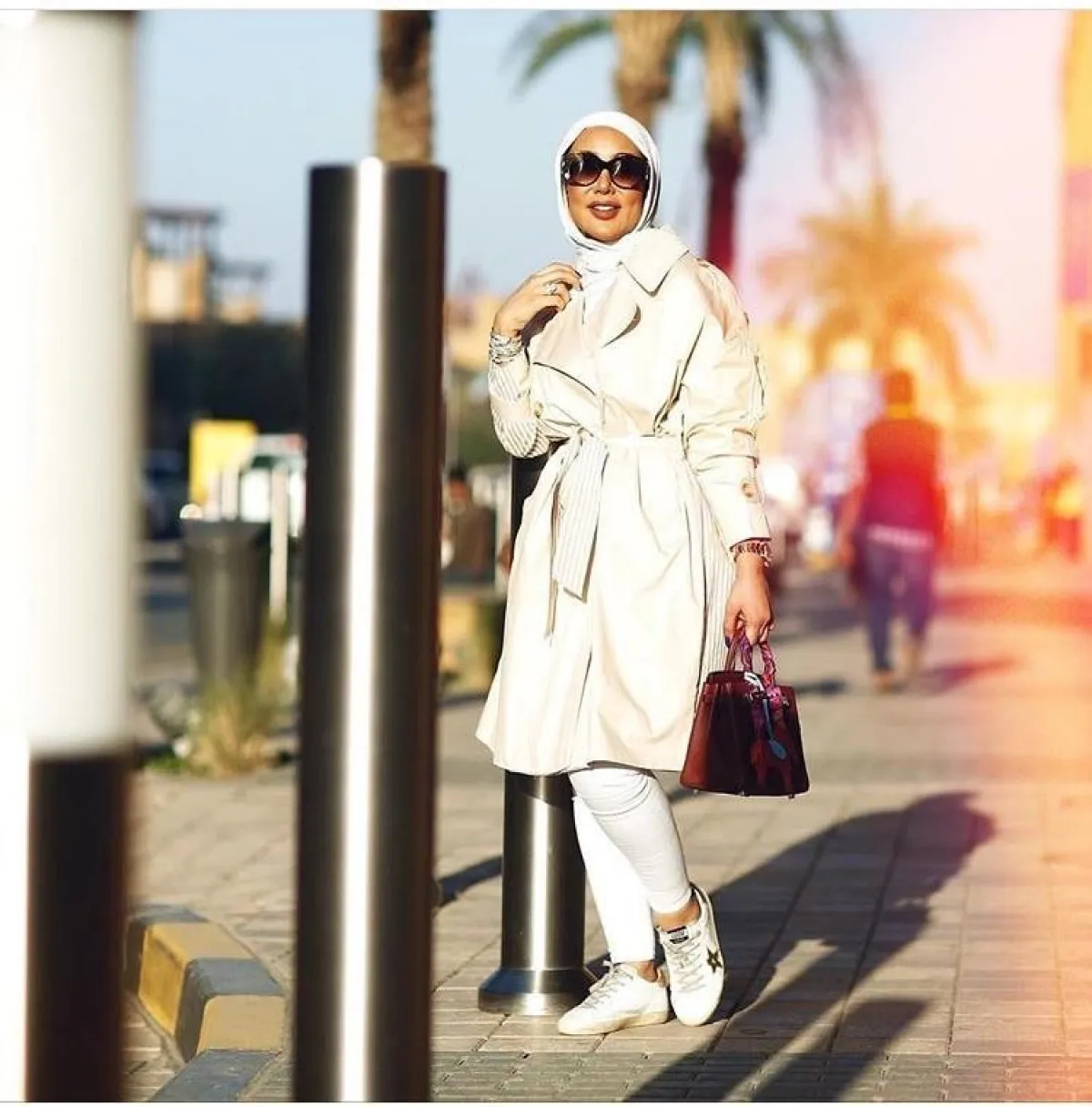 معطف الترينيش Trench coat من الصيحات الرائجة بربيع هذا الموسم، فلِمَ لا تعتمديه باللون الأبيض الثلجي أو الكريمي لاطلالة كاجوال، كاللوك من جمال النجادة، مع البنطلون الأبيض، وسنيكر من اللون نفسه، وشنطة باللون الأحمر العنبي.