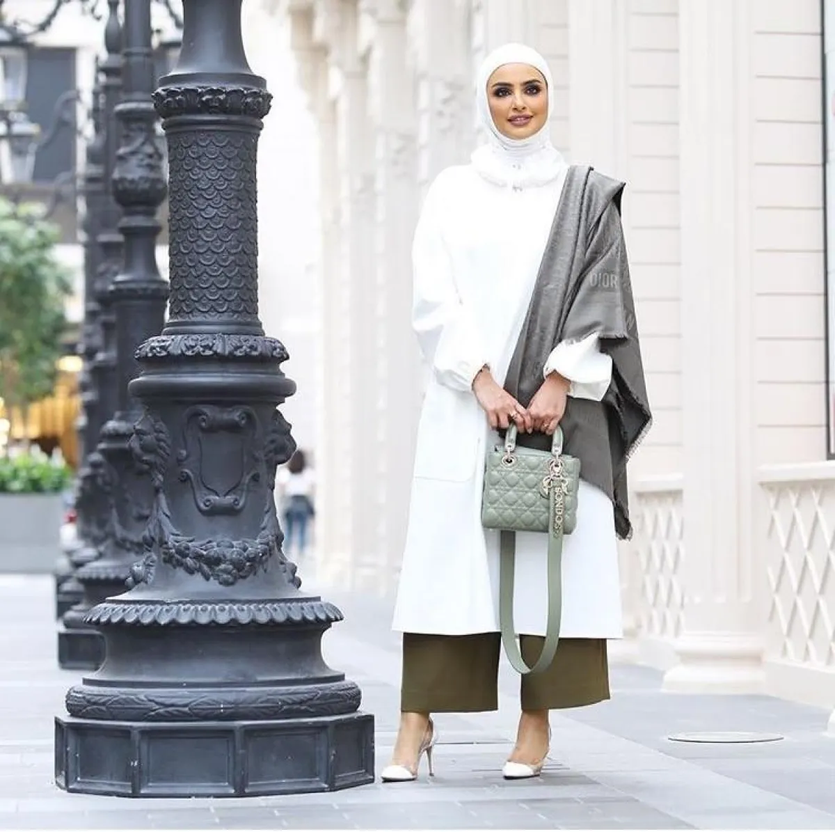 في المقابل اعتمدت المدونة سندس القطان على هذا اللون، ولكن بطريقة أكثر كلاسيكية تناسب شخصيتها، كالبلوزة الطويلة جدًّا مع كشكش على الرقبة والأكمام، نسقت معه شالًا خفيفًا من ديور Dior ، وشنطة من العلامة نفسها باللون الرمادي الثلجي، لاطلالة مناسبة للمرأة الثلاثينية فما فوق، وأنيقة كذلك للعمل في الطقس الحار.