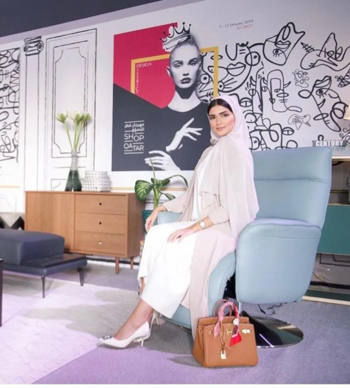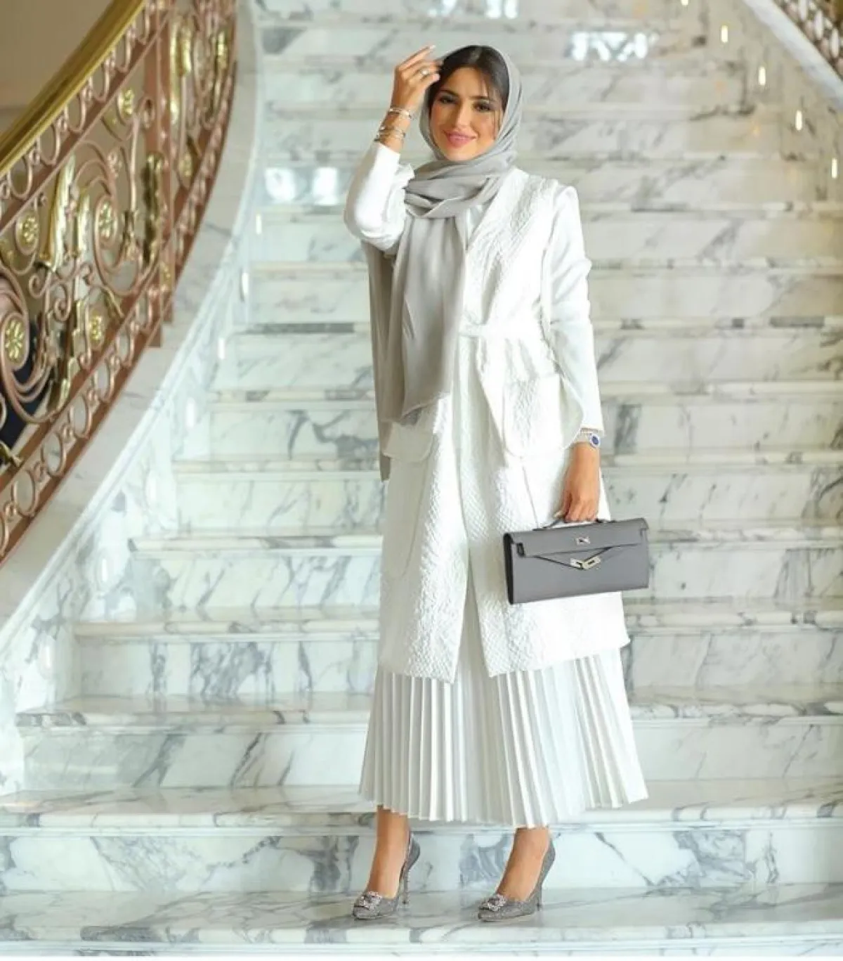 بطريقة كلاسيكية وناعمة اختارت المدونة الخليجية فاطمة حسام التنورة البيليسيه الساتان، التي ستستمر معنا لهذا الربيع أيضًا، مع معطف طويل أبيض بخامة مزركشة، نسقت معه شنطة يد أنيقة من هيرميس Hermes باللون الرمادي، أما الشوز فكانت كلاسيكية من الدرجة الأولى من علامة Manolo Blahnik مانولو بلانيك.