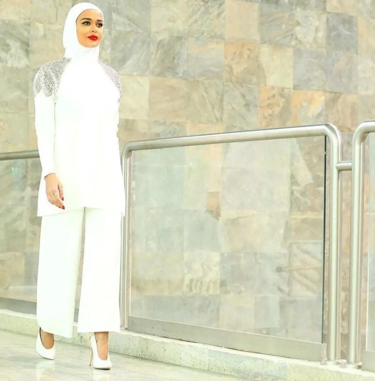 بآخر اطلالتها وواحدة من أزيائها الربيعية، اعتمدت الفاشينيستا مرمر محمد على البدلة الربيعية، ببنطلون واسع وأكمام وأكتاف مطرزة بالخرز الفضي، نسقتها بطريقة حيادية كاملة، وهي إحدى الطرق التي تفضلها مرمر بشكل كبير مع طرحتها البيضاء وشوز أبيض.