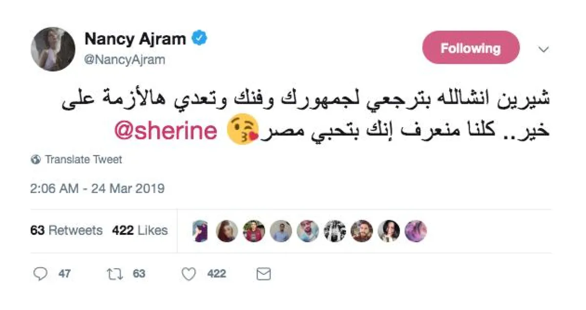 نانسي عجرم كذلك انضمت إلى حملة الدفاع عن شيرين حيث غردت قائلة: «شيرين انشالله بترجعي لجمهورك وفنك وتعدي هالأزمة على خير.. كلنا منعرف إنك بتحبي مصر».