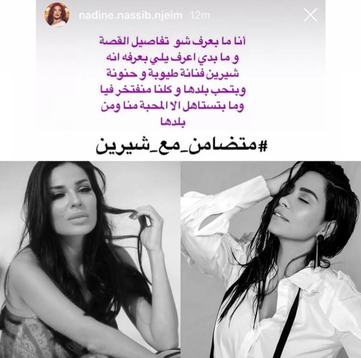نادين نسيب نجيم أكدت أنها لا تعرف القصة، ولا تريد أن تعرفها، ولكنها تعرف طيبة وحنان شيرين عبد الوهاب، وكيف تعشق وطنها، وأضافت: شيرين ما بتستاهل إلا المحبة منا ومن بلدها.