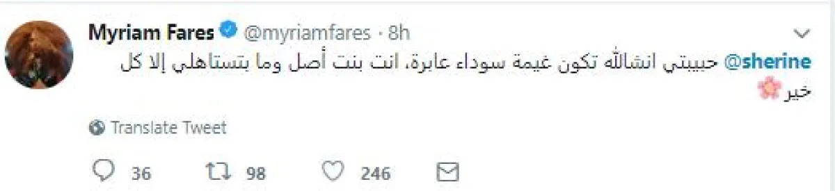 النجمة اللبنانية ميريام فارس وجهت دعمها مباشرة إلى شيرين بتغريدة قالت فيها: حبيبتي انشالله تكون غيمة سوداء عابرة، انت بنت أصل وما بتستاهلي إلا كل خير.