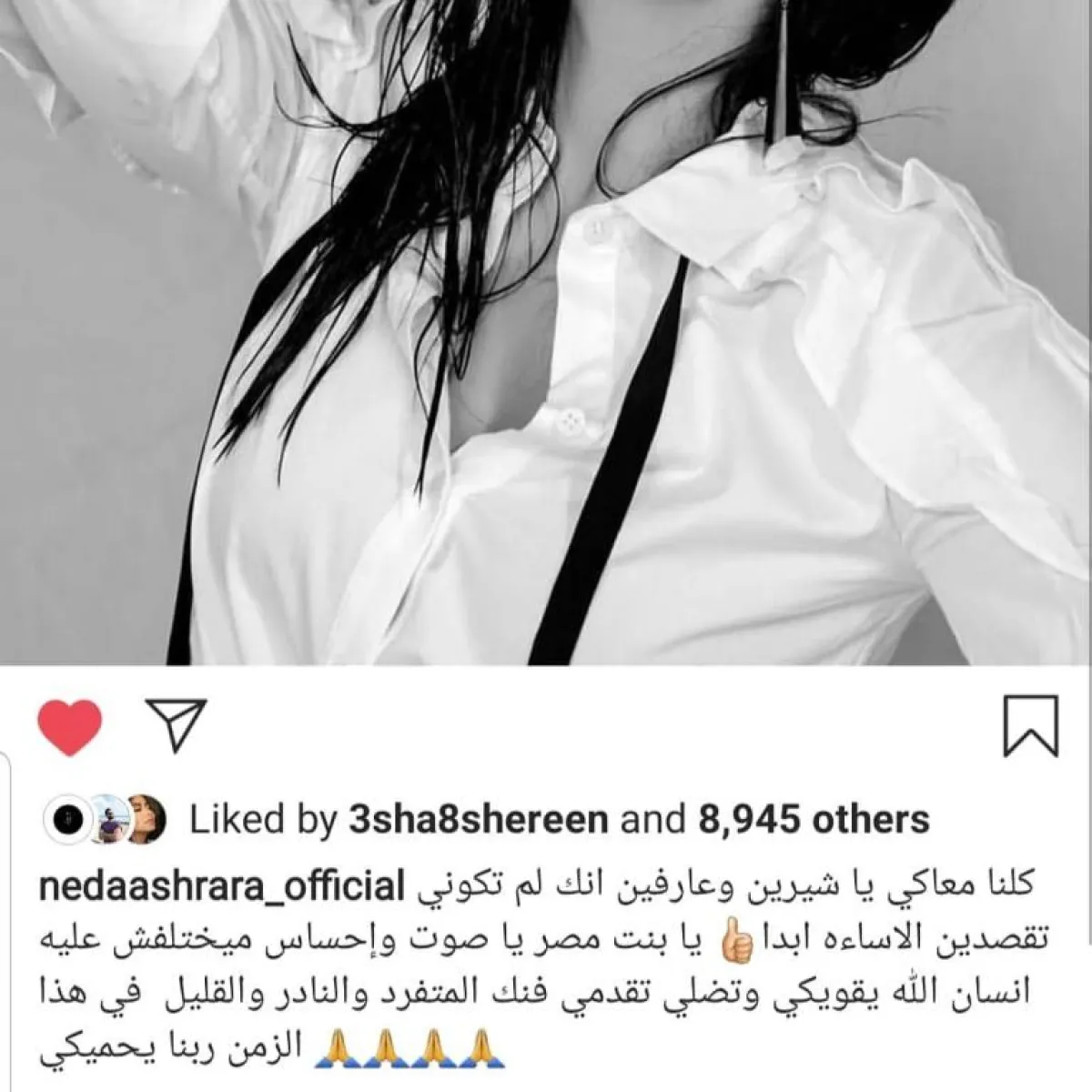 نجمة برنامج ذا فويس الأردنية نداء شرارة، قدمت الدعم لأستاذتها قائلة: كلنا معاكي يا شيرين، وعارفين أنك لم تكوني تقصدين الإساءة أبداً، يا بنت مصر، يا صوت وإحساس ميختلفش عليه إنسان، الله يقويكي وتضلي تقدمي فنك المتفرد والنادر والقليل في هذا الزمان، ربنا يحميكي.