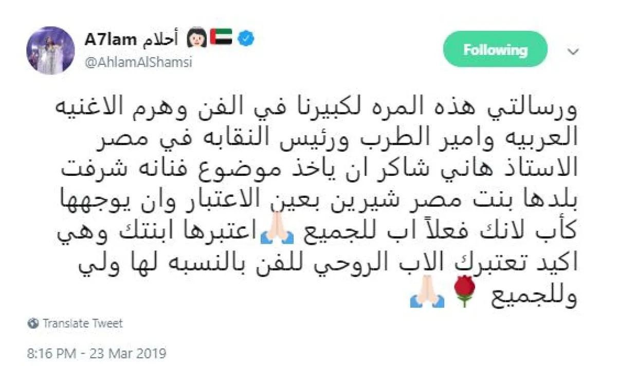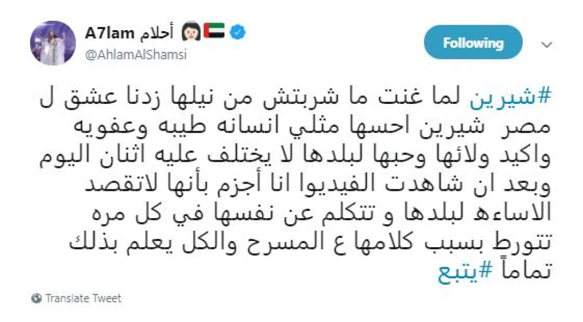 الفنانة أحلام كتبت عدة تغريدات، دفاعًا عن شيرين عبد الوهاب، قائلة: «شيرين لما غنت (ما شربتش من نيلها) زدنا عشقًا لمصر.. شيرين أحسها مثلي إنسانة طيبة وعفوية، وأكيد ولاؤها وحبها لبلدها لا يختلف عليه اثنان اليوم، وبعد أن شاهدت الفيديو أنا أجزم بأنها لا تقصد الإساءة لبلدها، وتتكلم عن نفسها في كل مرة تتورط بسبب كلامها على المسرح، والكل يعلم بذلك تمامًا».