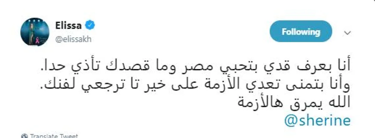 إليسا قدمت شهادة لصالح شيرين عبر تغريدة قالت فيها: أنا بعرف قدي بتحبي مصر وما قصدك تأذي حدا. وأنا بتمنى تعدي الأزمة على خير تا ترجعي لفنك. الله يمرق هالأزمة».