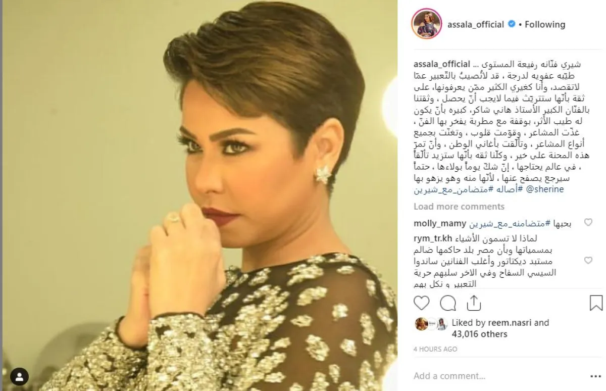 أصالة دافعت عن شيرين عبد الوهاب، مطالبة الجميع بتفهم طبيعتها «العفوية»، وكتبت تضامنًا معها عبر حسابها بموقع «إنستقرام»: «شيرى عفوية لدرجة قد لا تُصيبُ بالتّعبير عمّا لا تقصد، وأنا كغيري الكثير ممّن يعرفونها، على ثقة بأنّها ستتريّث فيما لا يجب أنّ يحصل، وثقتنا بالفنّان الكبير هاني شاكر كبيرة؛ بأنّ يكون له طيب الأثر، بوقفة مع مطربة يفخر بها الفنّ، غذّت المشاعر، وقوّمت قلوب، وتغنّت بجميع أنواع المشاعر، وتألّقت بأغاني الوطن، وأنّ تمرّ هذه المحنة على خير».