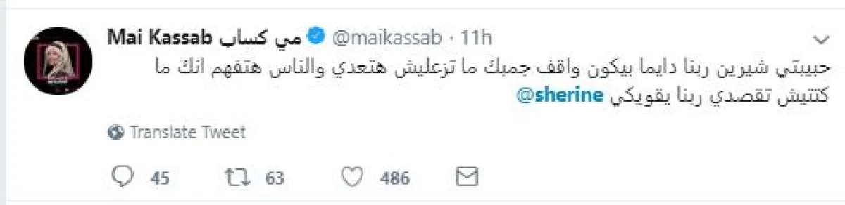 مي كساب دعمت مواطنتها شيرين قائلة: حبيبتي شيرين ربنا دايماً بيكون واقف جمبك ما تزعليش هتعدي، والناس هتفهم إنك ما كنتيش تقصدي ربنا يقويكي.