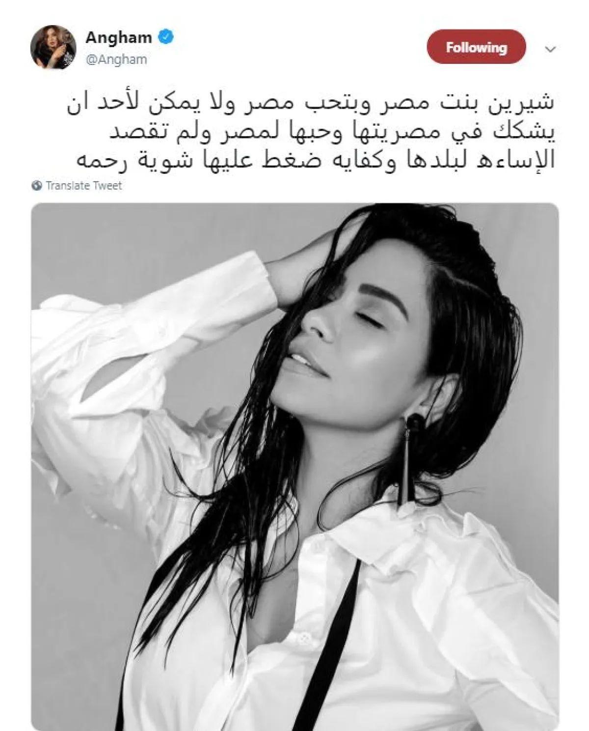 المطربة أنغام تحملت الكثير من الانتقادات القاسية، مع إصرارها على الدفاع عن زميلتها، وغردت قائلة: «شيرين بنت مصر وبتحب مصر، ولا يمكن لأحد أن يشكك في مصريتها وحبها لمصر، ولم تقصد الإساءة لبلدها، وكفاية ضغط عليها شوية رحمة».