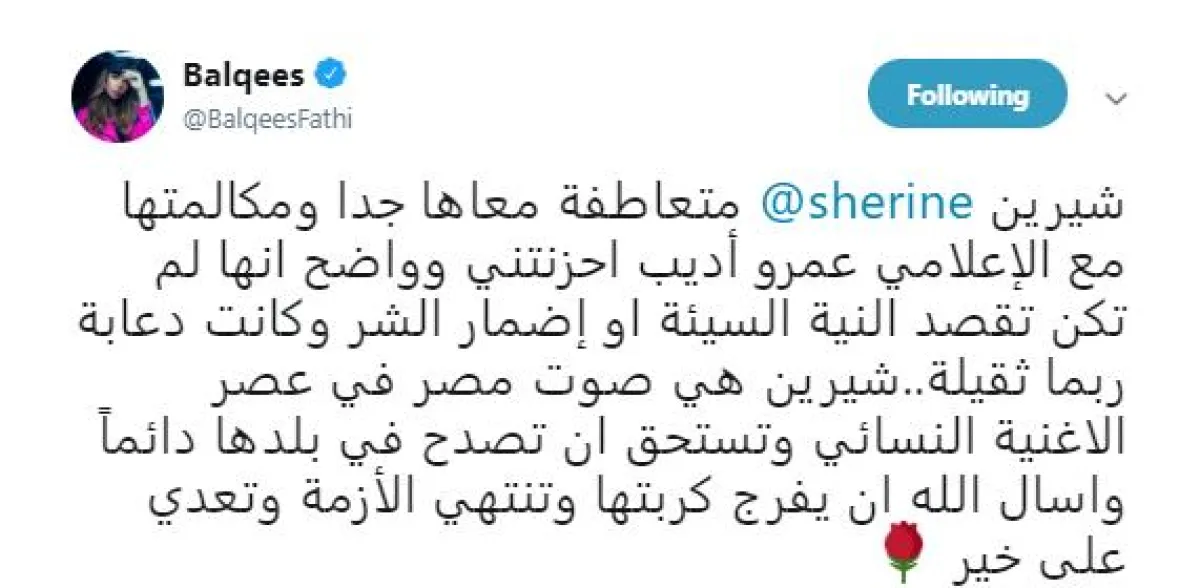 بلقيس تعاطفت مع دموع شيرين بعد مداخلتها الهاتفية مع برنامج الحكاية، وتضامنت معها عبر تغريدة قالت فيها: شيرين sherine متعاطفة معاها جداً ومكالمتها مع الإعلامي عمرو أديب أحزنتني وواضح أنها لم تكن تقصد النية السيئة، أو إضمار الشر وكانت دعابة ربما ثقيلة.. شيرين هي صوت مصر في عصر الأغنية النسائي، وتستحق أن تصدح في بلدها دائماً وأسال الله أن يفرج كربتها وتنتهي الأزمة وتعدي على خير.
