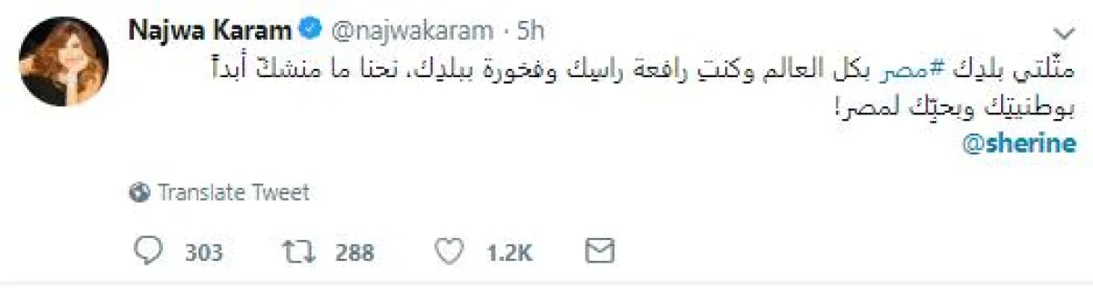 نجوى كرم أصابت الهدف ورفضت التشكيك بوطنية شيرين عبد الوهاب قائلة: مثّلتي بلدِك #مصر بكل العالم وكنتِ رافعة راسِك وفخورة ببلدِك، نحنا ما منشكّ أبداً بوطنيتِك وبحبِّك لمصر!