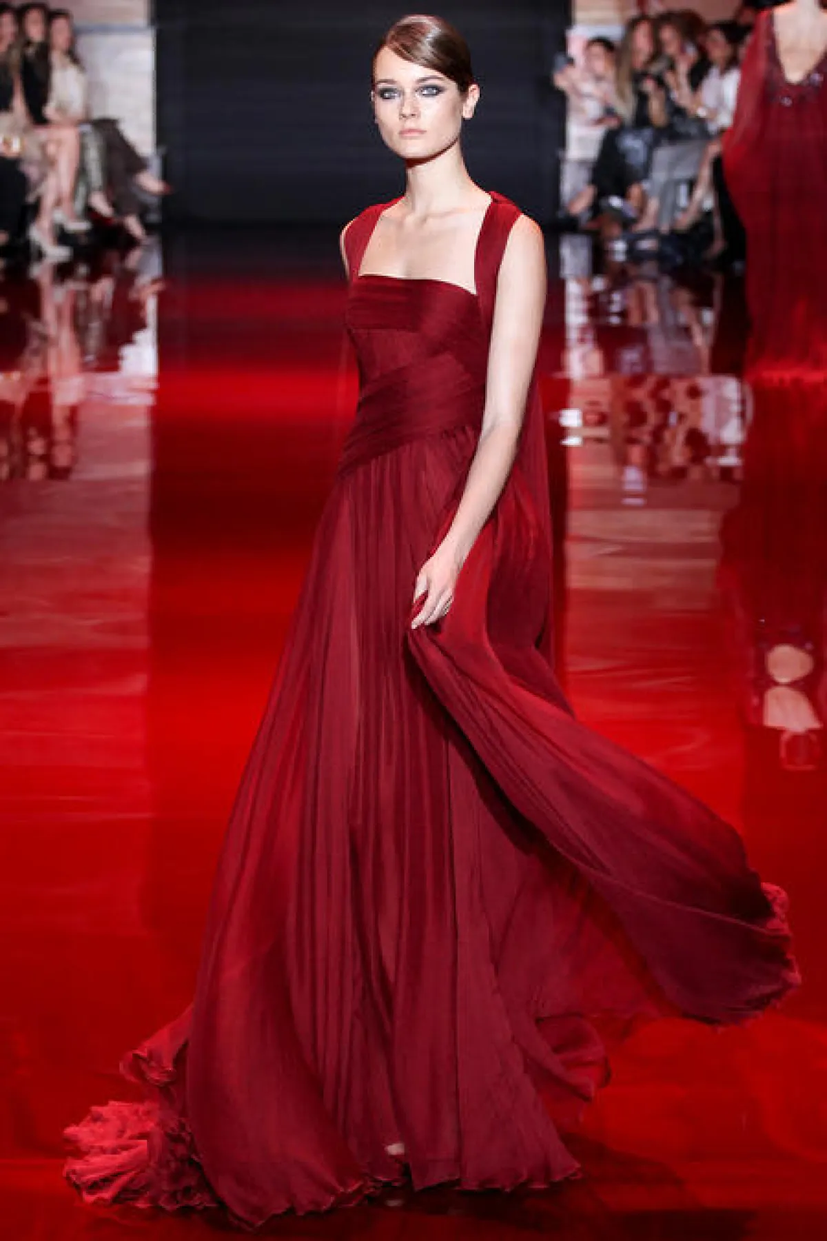 اختارت Dakota فستاناً ناعماً باللون الأحمر من مجموعة الأزياء الراقية لربيع وشتاء 2013- 2014، ونسَّقته مع تسريحة شعر مرفوعة وسوار ناعم.