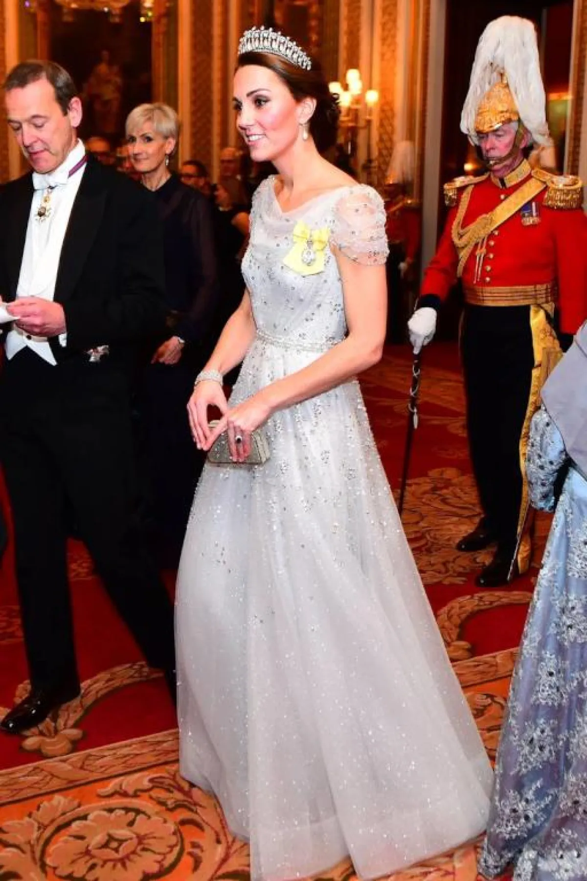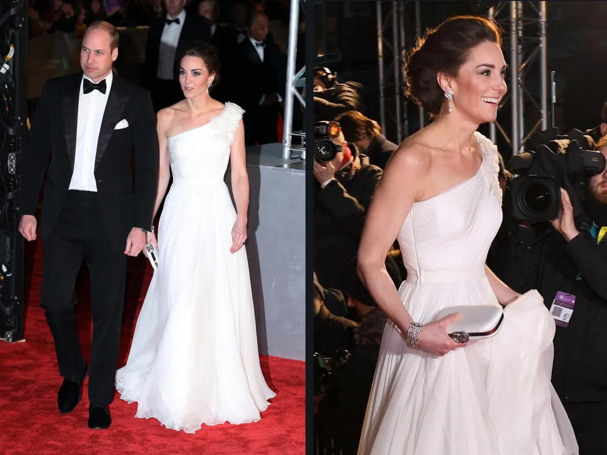في إحدى المناسبات الرسمية وعلى السجادة الحمراء هذا العام، شاهدنا كيت ميدلتون Kate Middleton وقد تألقت باطلالة مفعمة بالأنوثة، كانت عبارة عن فستان باللون الأبيض من قماش الموسلين الفاخر بقصة الكتف الواحد، اختارته من دار “ألكسندر مكوين” Alexander McQueen وقد نسقت معه حقيبة كلاتش باللون الأبيض وأقراطًا بتصميم فاخر.