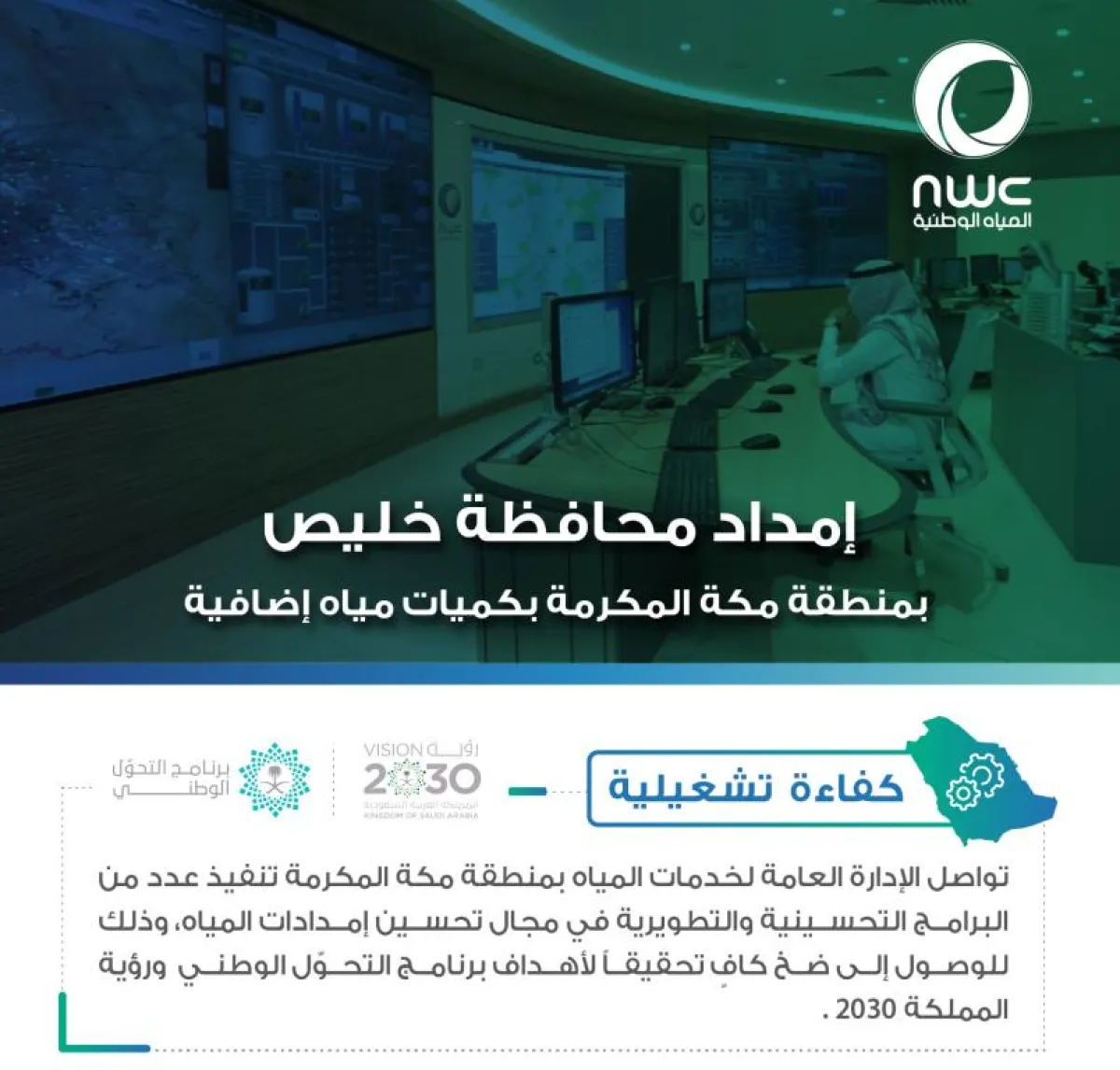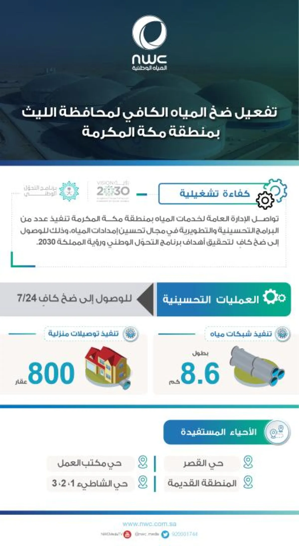 أنهت شركة المياه الوطنية ممثلة بالإدارة العامة لخدمات المياه بمنطقة مكة المكرمة، أعمال استكمال المرحلة الأولى من أعمال تمديد شبكات المياه والتوصيلات المنزلية بمحافظة الليث وتشغيلها. إضافة إلى البدء في ضخ كميات إضافية من المياه تبلغ 10 آلاف م3 لتغطية 5 آلاف توصيلة تخدم 16 حيًا عبر الشبكة إلى محافظة خليص تضاف إلى الكميات المعتادة‪.‬‬