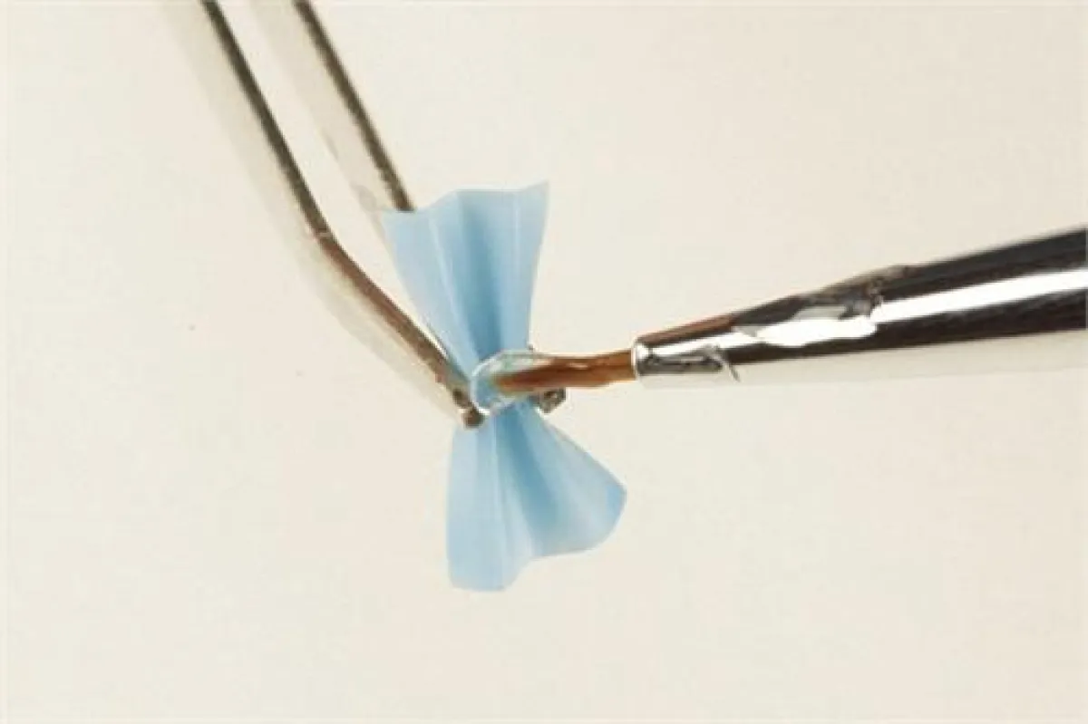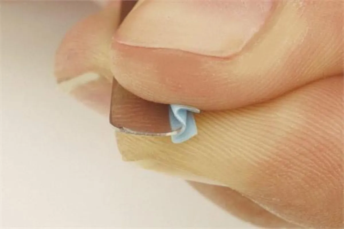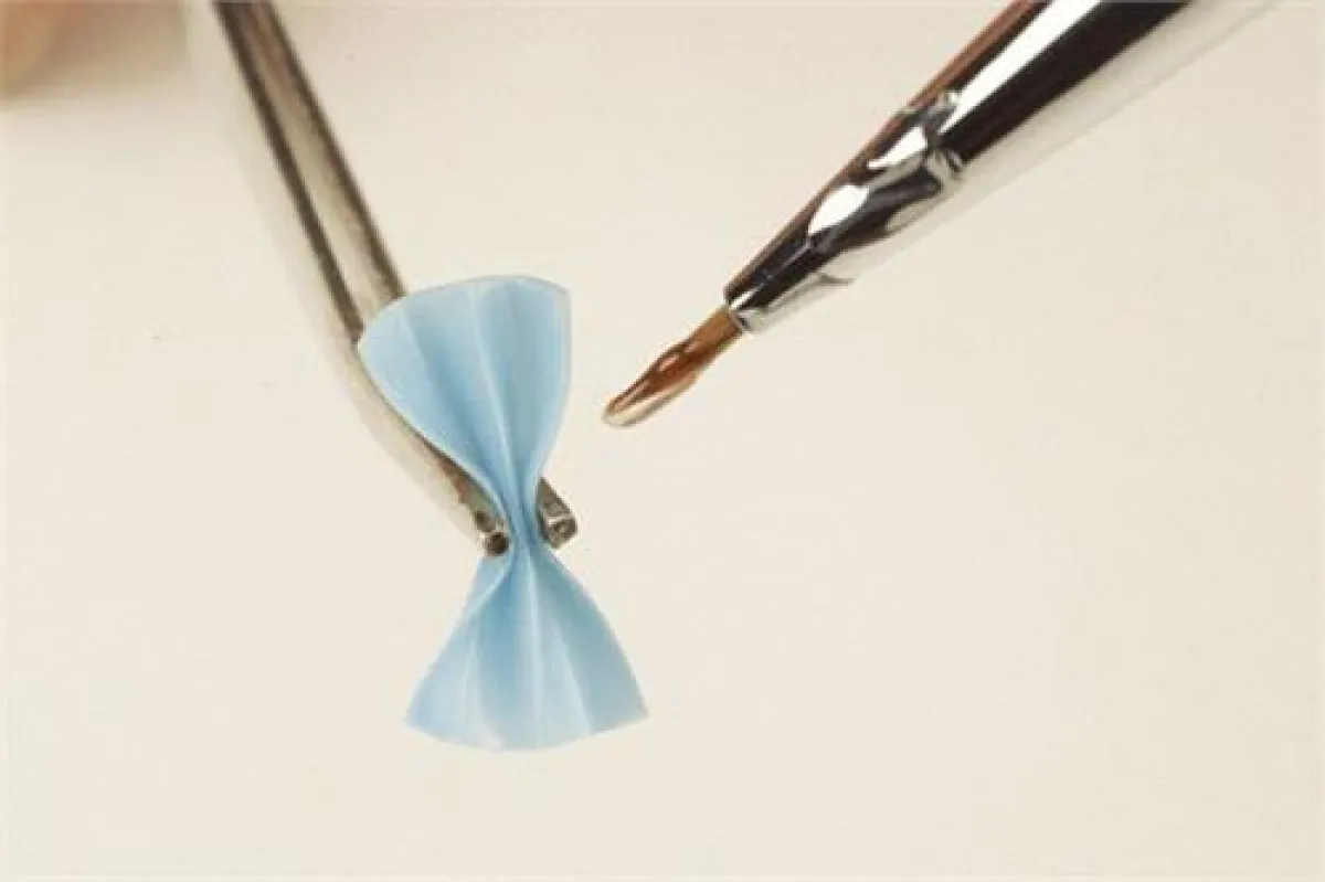 7. اضغطي على منتصف الطيّة مرّة أخرى، بواسطة الملقط، وضعي قطرة من "الجل" المرن على الجهة الخلفيّة من الطيّة، وضعيها تحت الأشعة ما فوق البنفسجيّة، لمدّة ثلاثين ثانية.