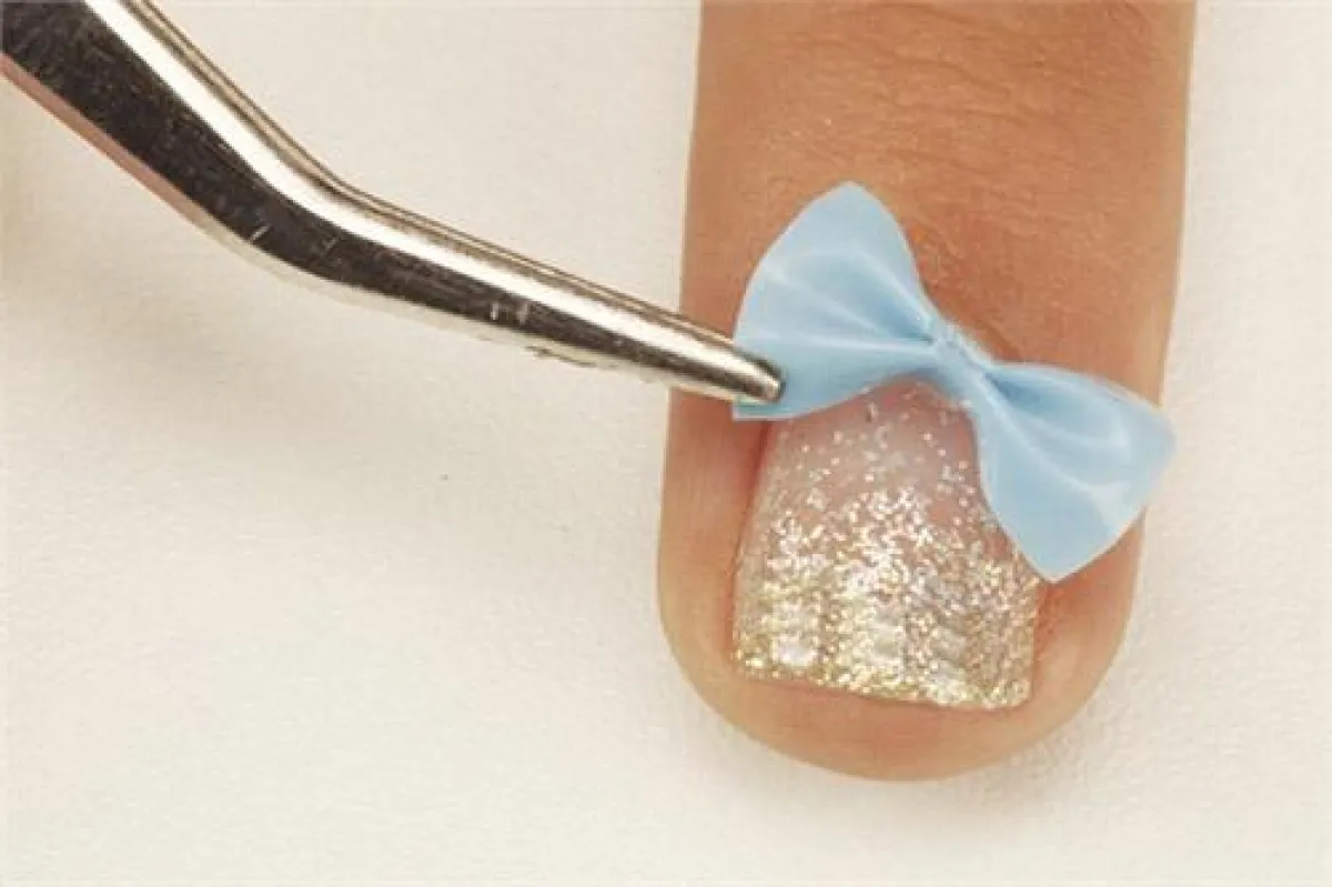 8. من المفضّل تثبيت "الجل" الثلاثيّ الأبعاد على ظفر مقلّم. استخدمي فرشاة خاصّة بالأظافر لوضع قطرة صغيرة من "الجل"، حيث ترغبين في وضع العقدة. ثبّتيها، وضعيها تحت الأشعة لمدّة دقيقتين. أضيفي المزيد من "الجل" عند منتصف العقدة لتثبيت أسفلها، مع الحرص على أن تبقى في مكانها. يُمكنك أيضاً تزيين العقدة عبر وضع القليل من الأحجار اللمّاعة فيها