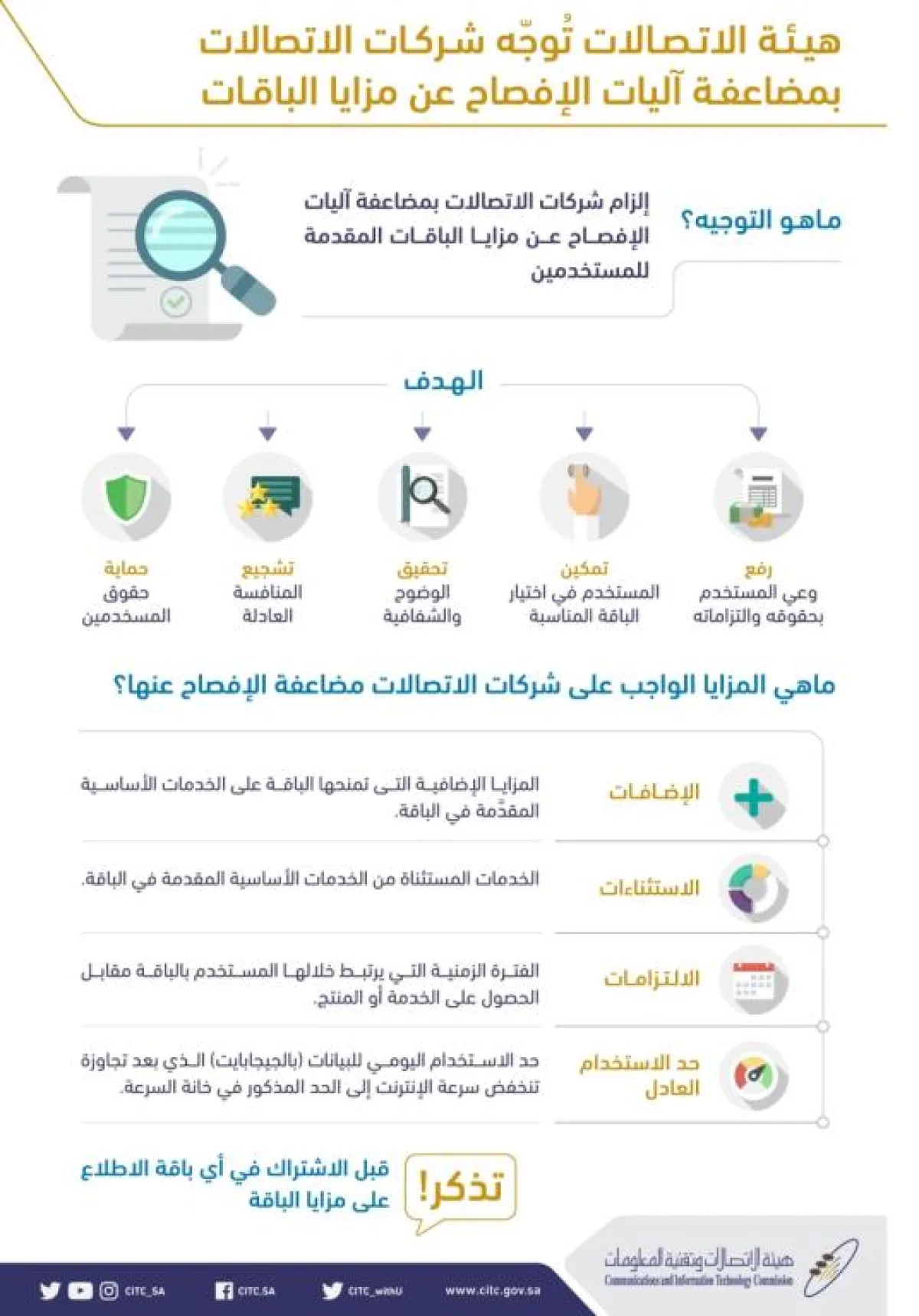 وأضاف التميمي، أن هذا التوجيه مُلزم لجميع شركات الاتصالات في المملكة، مؤكداً، بأن للمستخدم الحق في أن يطلب من شركات الاتصالات الإفصاح عن تفاصيل وبيانات المزايا والخصائص المرتبطة بالباقة التي يرغب في الحصول عليها أو الاشتراك بها.