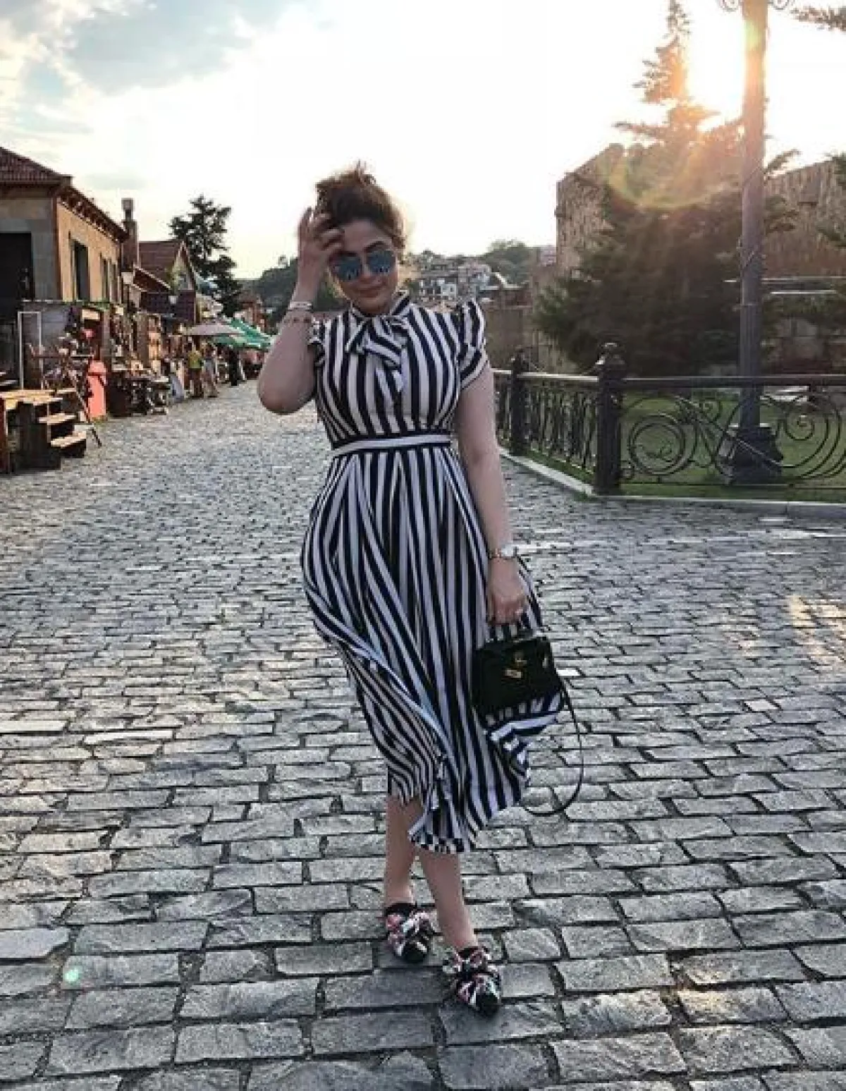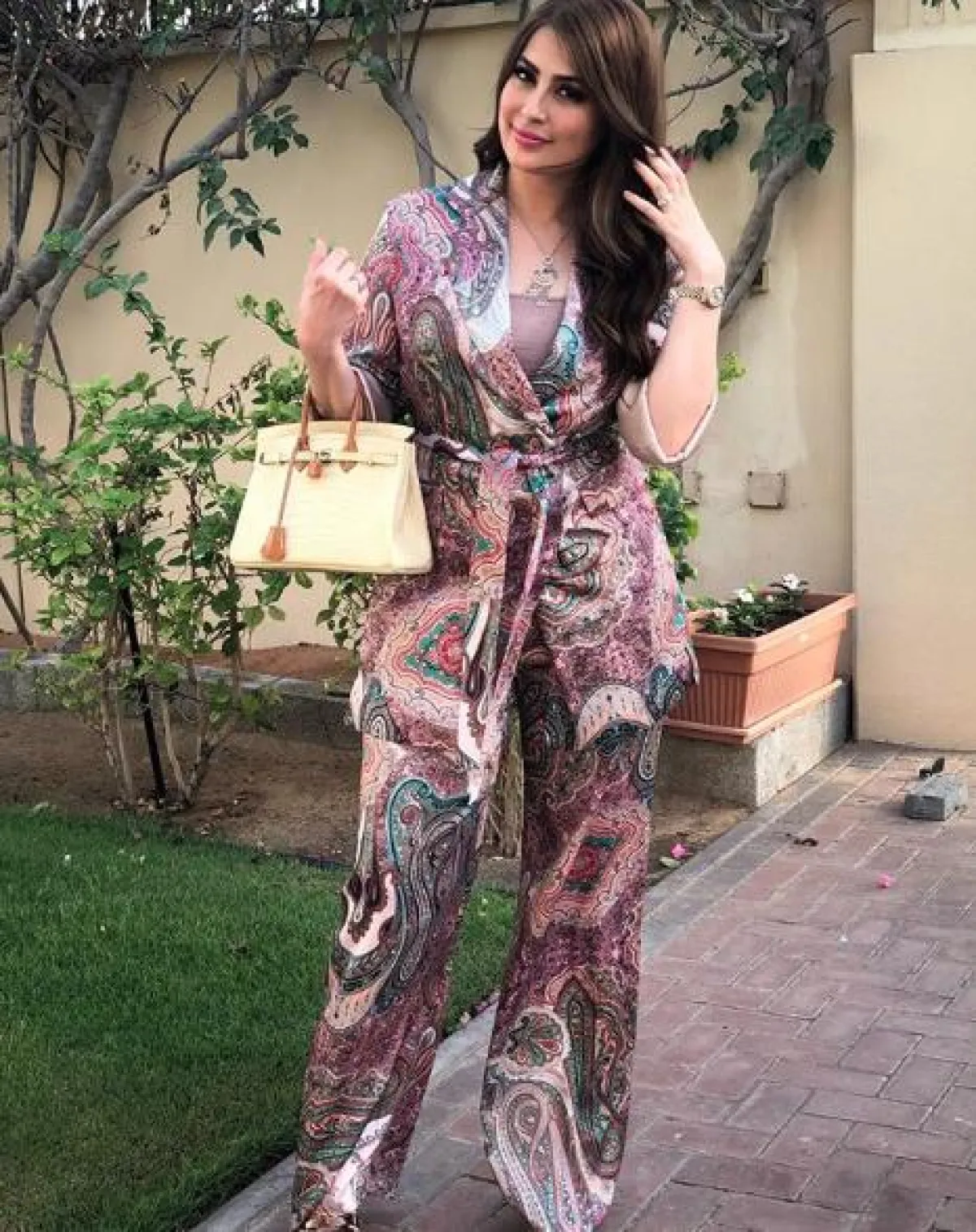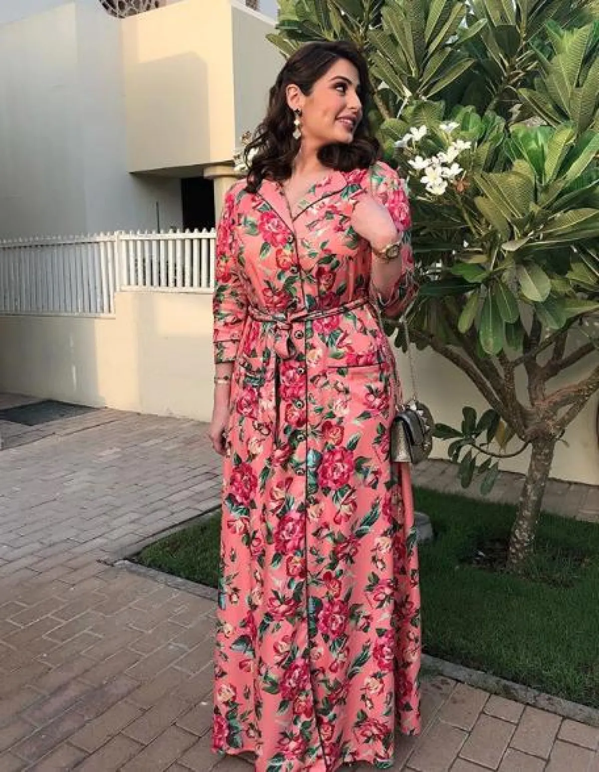 الفساتين الماكسي مثالية لاطلالات فصلي الربيع والصيف، ولاسيما تلك الملونة والمعرقة منها، مثل الفستان الذي اختارته رؤى الصبّان في أحد المشاوير الصباحية، المصنوع من قماش باللون الزهري معرق برسومات الورود، وقد نسقت معه شنطة يد باللون البرونزي من “فالنتينو” Valentino وبعض المجوهرات الناعمة.