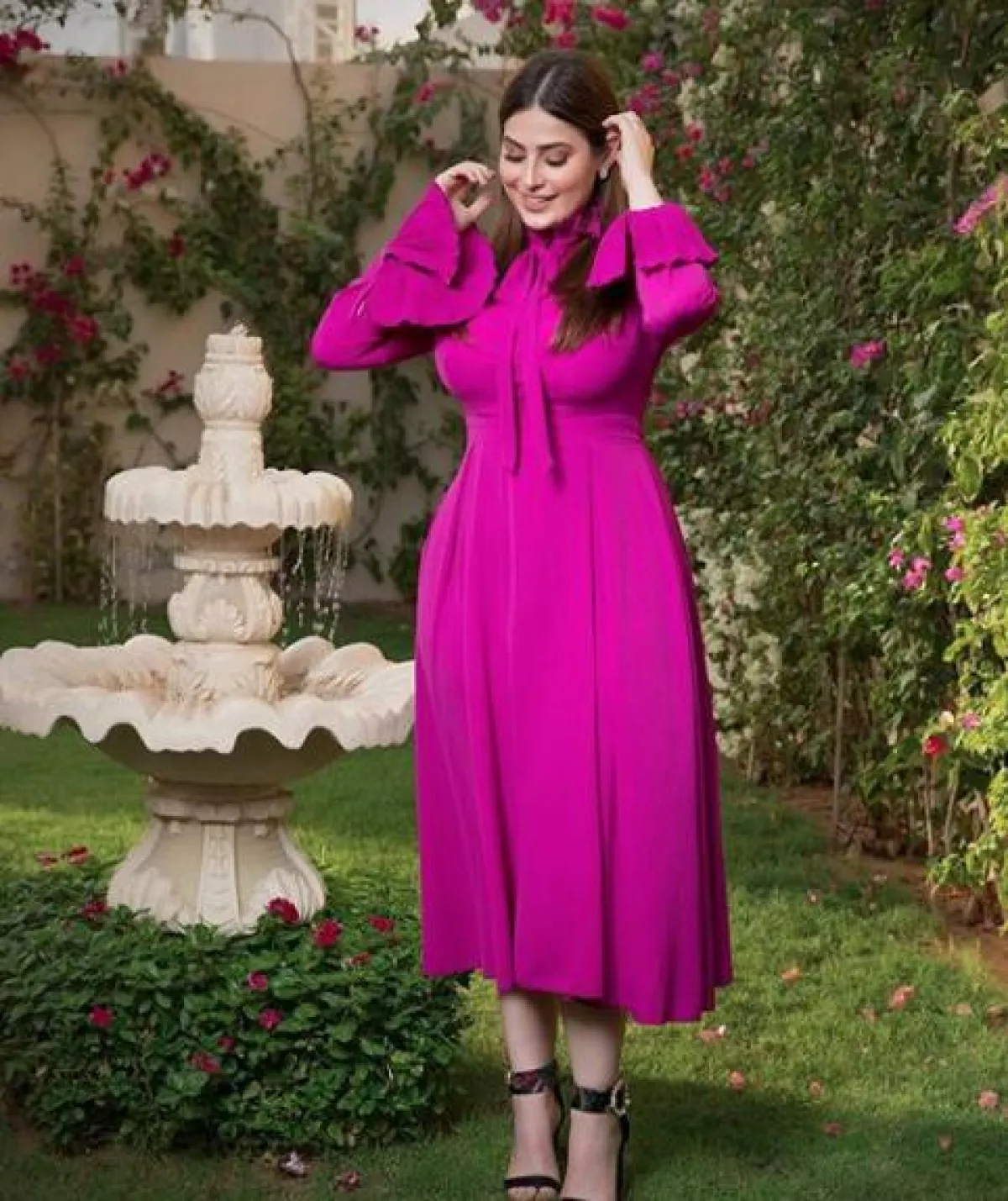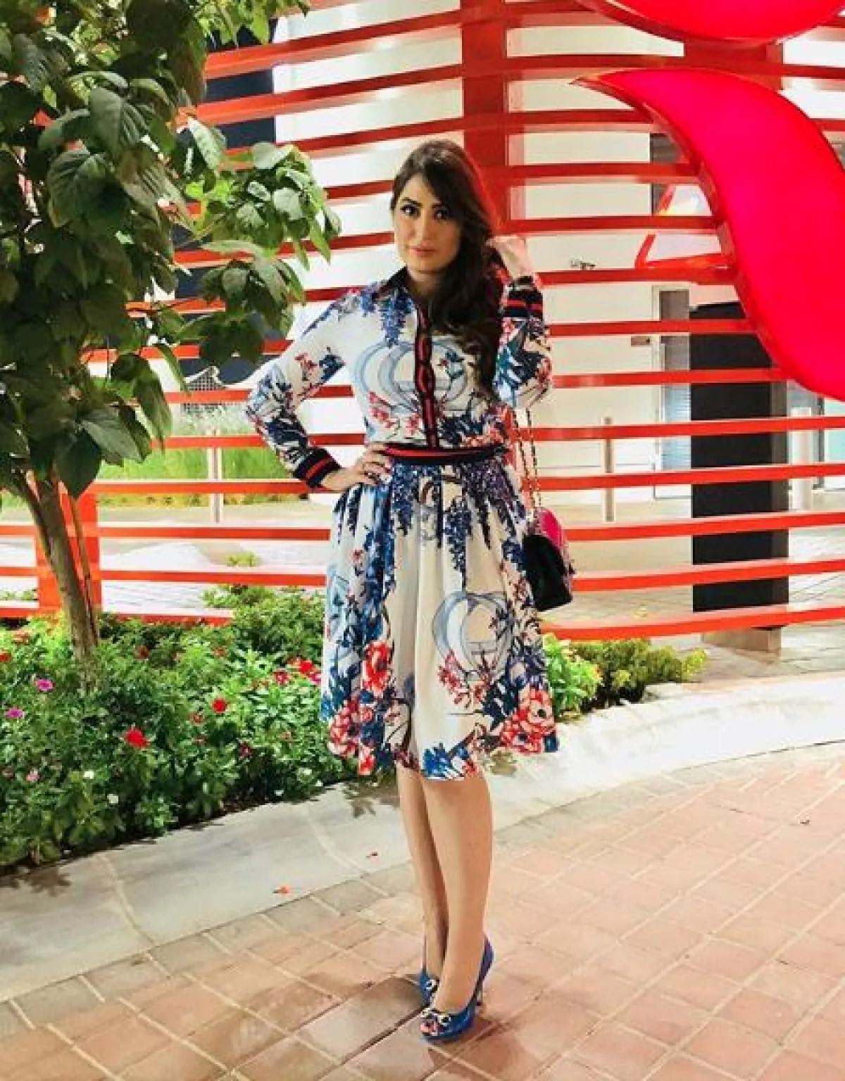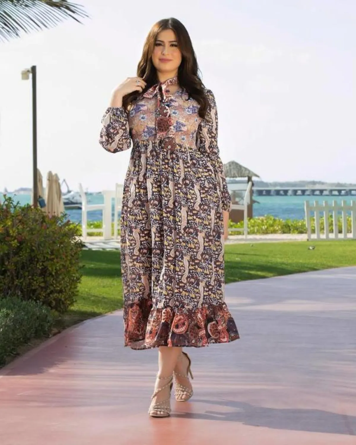 في إحدى اطلالات رؤى الصبّان، شاهدناها في لوك ربيعي مفعم بالأنوثة، حيث اختارت فستان ميدي معرّقًا بألوان هادئة، جمعت بين البيج والأحمر والبنفسجي، قصته ناعمة، مزينًا بربطة عند الياقة، وكشكش صغير من الأسفل، وقد نسقت معه صندلًا بكعب عالٍ باللون البيج الأبيض، مزينًا بمسامير معدنية.