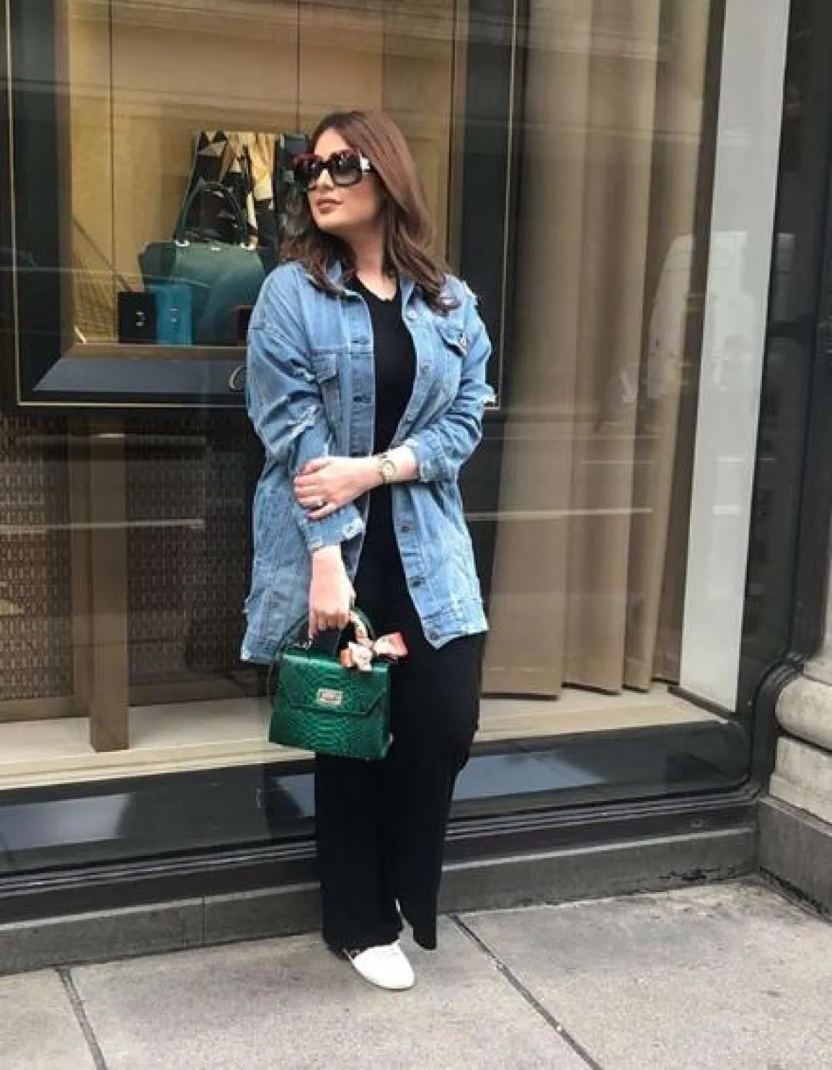 وفي أحد المشاوير الصباحية، شاهدنا رؤى الصبّان وقد نسقت لوك شبابيًّا وعمليًّا، اختارت فيه بنطلونًا قماشيًّا مع تيشرت قطنية باللون الأسود، ومن فوقهما نسقت جاكيت جينز طويل، وأكملت اللوك بحذاء رياضي باللون الأبيض، وشنطة يد أنيقة من الجلد باللون الأخضر، ونظارات شمسية كبيرة من “غوتشي” Gucci.
