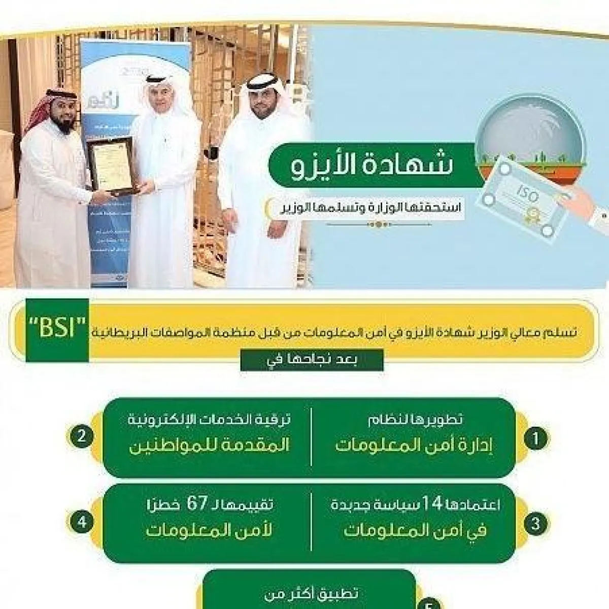 وتسلّم وزير البيئة والمياه والزراعة المهندس عبدالرحمن بن عبدالمحسن الفضلي، شهادة "الأيزو" التي تعد من أرفع الشهادات في العالم في مجال حماية وأمن المعلومات، بعد أن عملت على تطوير إطار أمن المعلومات ISMS خلال الفترة من شهر مارس وحتى ديسمبر 2018م، حيث اعتمدت 14 سياسة جديدة في أمن المعلومات، وأنهت حصر وتقييم 1059 من ممتلكات وأصول الإدارة العامة لتقنية المعلومات، وتقييم 67 خطراً لأمن المعلومات، إضافة إلى تطبيق أكثر من 70 تدبيراً أمنياَ (Security controls).