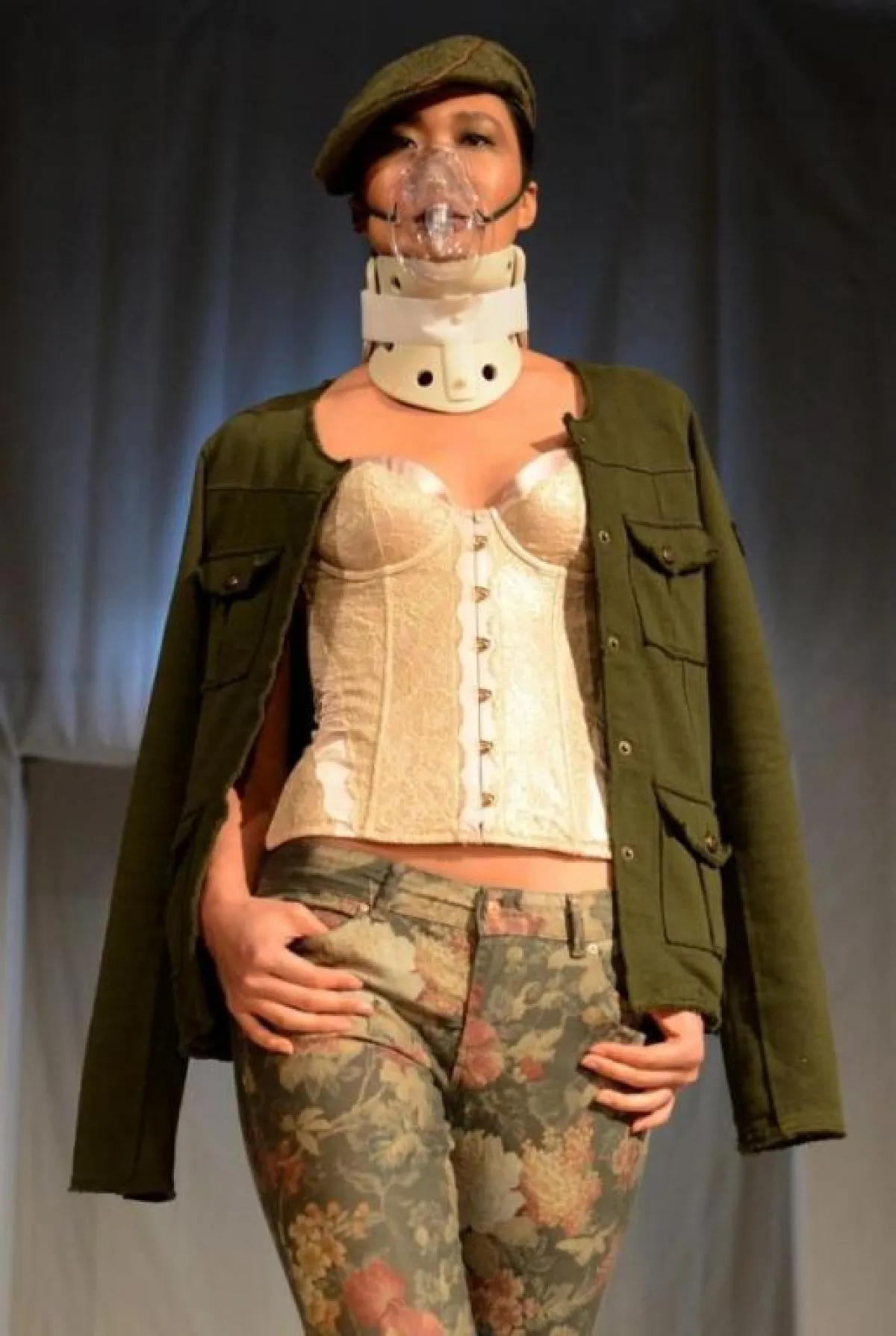 وللغرض نفسه، نظم مصممون صينيون عرضاً بعنوان «ضد الحرب.. ضد العنف» في نانجنينغ، وهدف إلى إعلان رفضهم للتوتر الحدودي بين بلادهم واليابان، وارتدى جميع العارضين والعارضات أغطية رأس تخفي الوجه تماماً؛ تعبيراً عن حالة الخوف التي تعتري كثيرين.