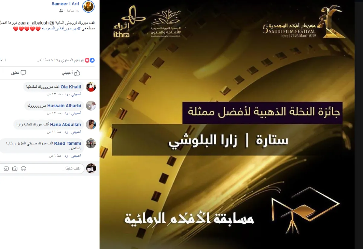كما نشر زوجها المخرج سمير عارف عبر صفحته في "فيس بوك" صورةً، وعَلَّقَ عليها قائلاً: "ألف مبروك لزوجتي الغالية @zaara_albalushi فوزَها بأفضل ممثلة في مهرجان أفلام السعودية".
