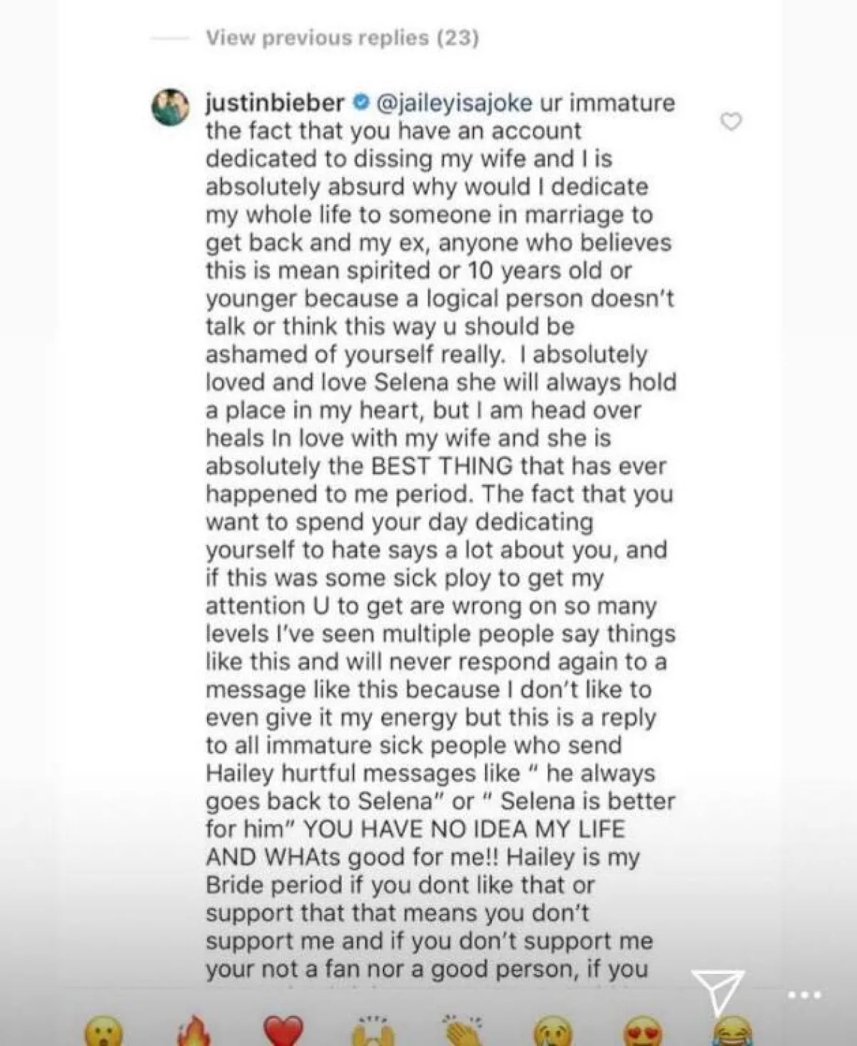 التعليق والتدخل في حياة بيبر الخاصة أثار غضبه ودفعه للرد على مروجي هذه الأنباء، برسالة طويلة نفى فيها كل هذه الادعاءات، وأكد أنه يعيش حالة حب صادقة مع زوجته الحالية هايلي بالدوين، مشيراً إلى أنه ليس من المنطقي أن يضحي بحياته ويتزوج من فتاة فقط من أجل الانتقام من سيلينا.