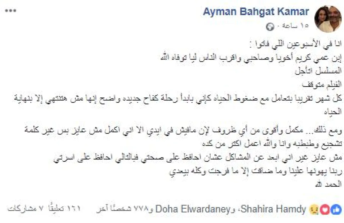 تابع قائلا: ومع ذلك... مكمل وأقوى من أي ظروف لإن مافيش في ايدي الا اني اكمل مش عايز بس غير كلمة تشجيع وطبطبه وانا والله اعمل اكتر من كده، مش عايز غير اني ابعد عن المشاكل عشان احافظ على صحتي فبالتالي احافظ على اسرتي، ربنا يهونها علينا وما ضاقت إلا ما فرجت وكله بيعدي، الحمد لله.
