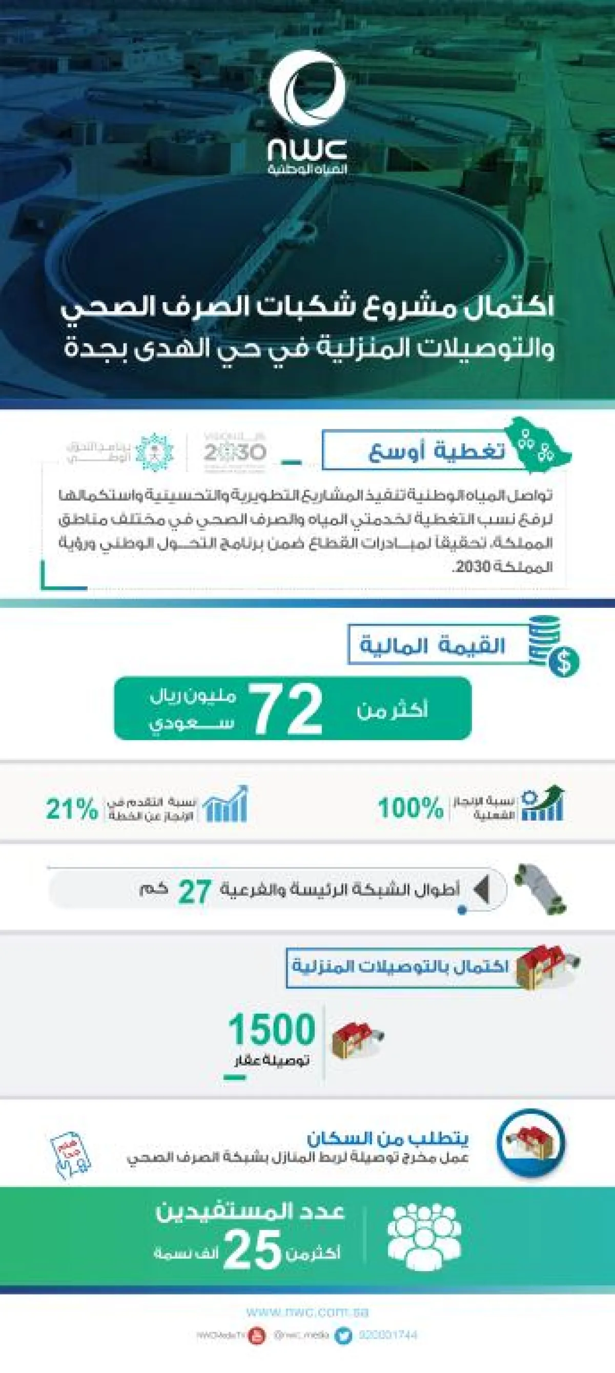 أعلنت شركة المياه الوطنية اكتمال مشروع شبكات الصرف الصحي وتوصيلاته بحي الهدى الجنوبي (الطحلاوي) بمحافظة جدة، وبدأ التشغيل الفعلي لها، وذلك بتكلفة مالية تجاوزت (72) مليون ريال.