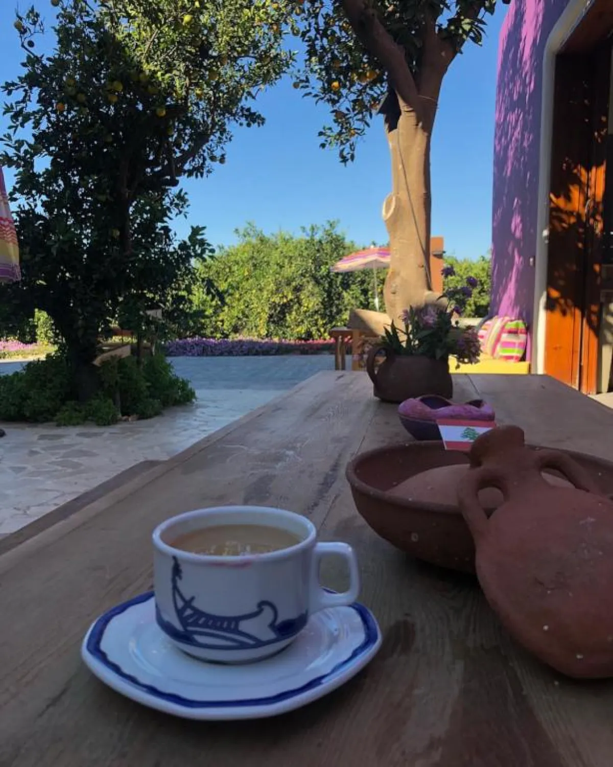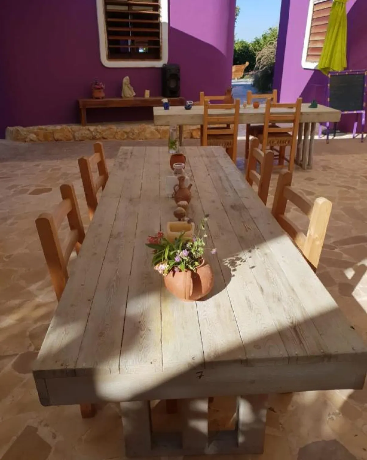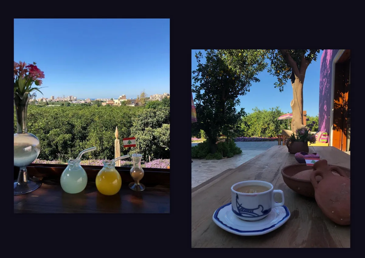 تتوسط ساحتها الكبيرة طاولات وكراسٍ للزوار، للتمتع بمائدة الغداء الذي يقدمه مطعم محترفات صور، حيث هناك مختلف أنواع المأكولات اللبنانية- والمأكولات الشهيرة في صور، مثل سندويشات "الفتايل" وغيرها، كذلك لم تخلُ الأجواء من صاج المرقوق وجرن الكبة .