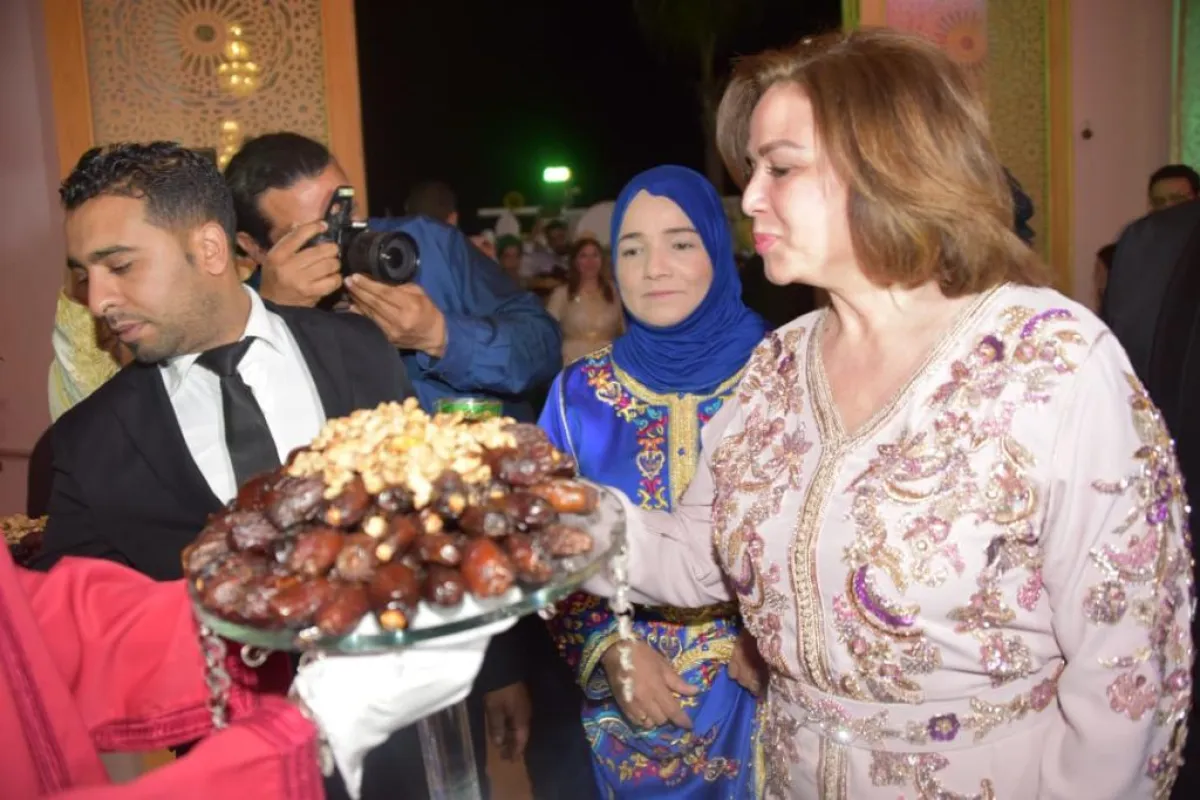 ومع اختتام هذا العرس الجميل، كان في انتظار الضيوف، "بوفيه" شمل مختلف الأطباق المغربية الشهية والمميزة، مثل: الكسكس، والمشوي، والطاجن، و"الكوارع"، و"البسطيلة" و"...غيرها كثير. كما قُدّم الشاي المغربي والحلويات التقليدية بمختلف أشكالها .
