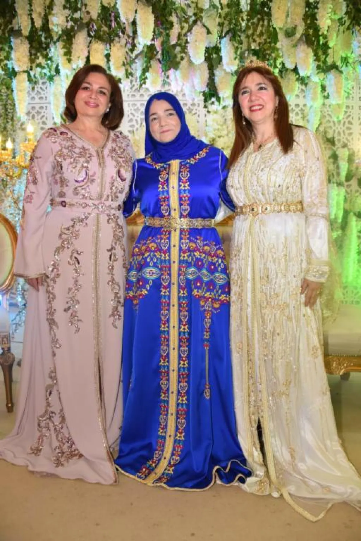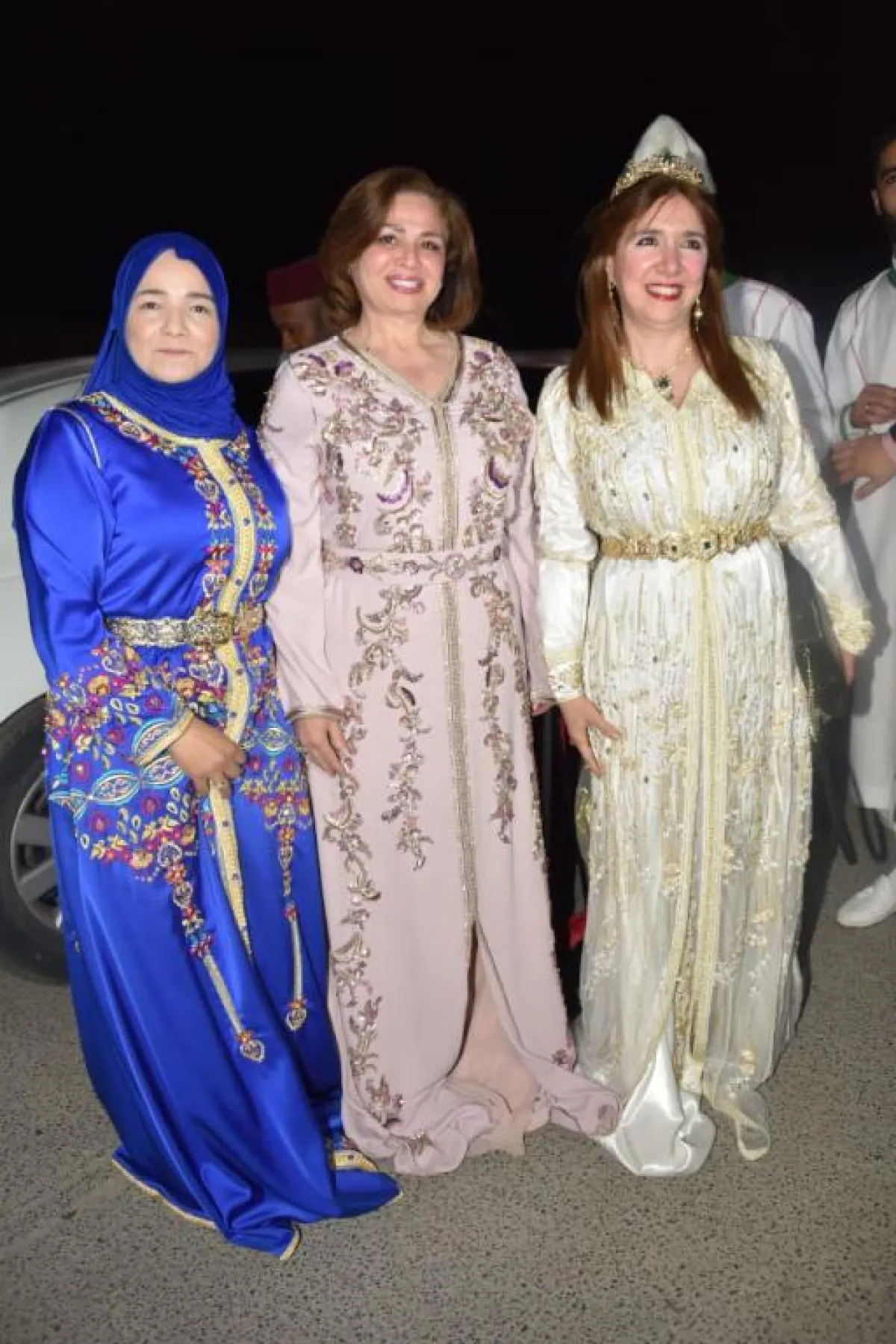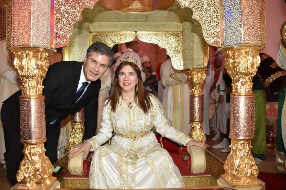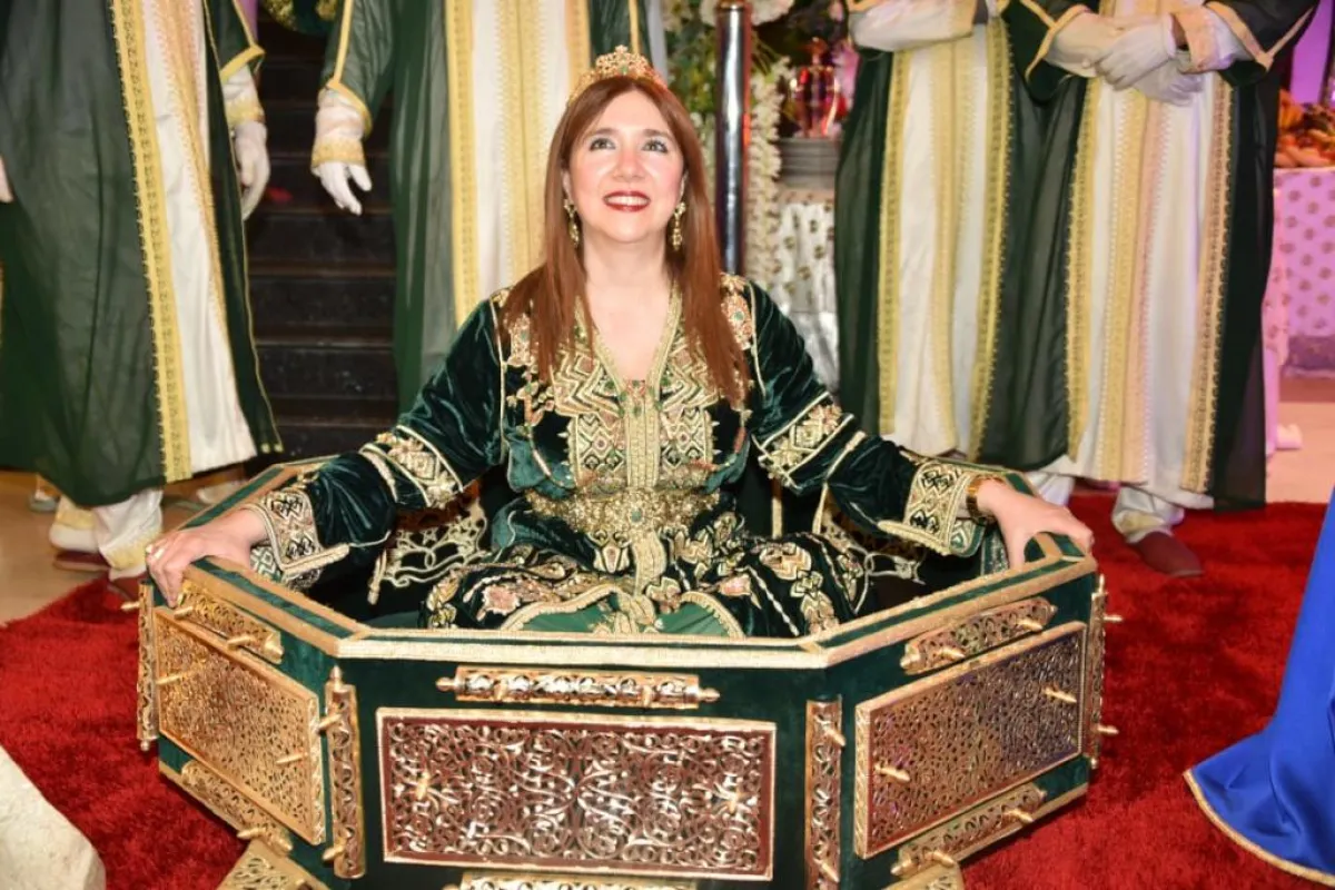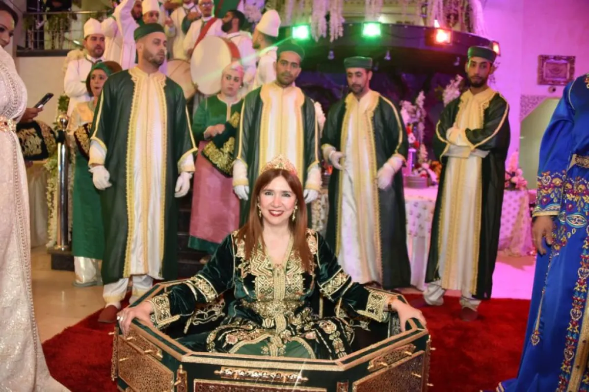 وأطلت عروس الحفل على الحضور وهي تجلس وسط "العمارية"، مرفوعة على الأكتاف من قبل أربعة شبان، وكانت ترتدي زيًّا مغربيًّا تقليديًّا باللون الأبيض، مطرزًا بالحرير، ومزينًا بالأحجار. وتزينت بالمجوهرات الأصيلة.
