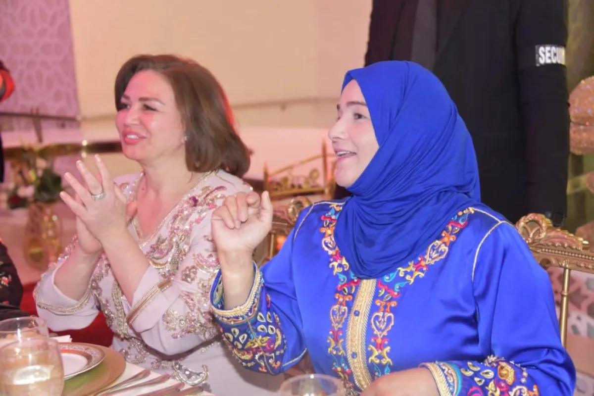 وصلت دينا، إلى قاعة الحفل وكان في استقبالها فرقة "الدقايقة"، ودخلت القاعة ترافقها الفنانة إلهام شاهين، على أنغام الزفة المغربية وزغاريد "النكافات".