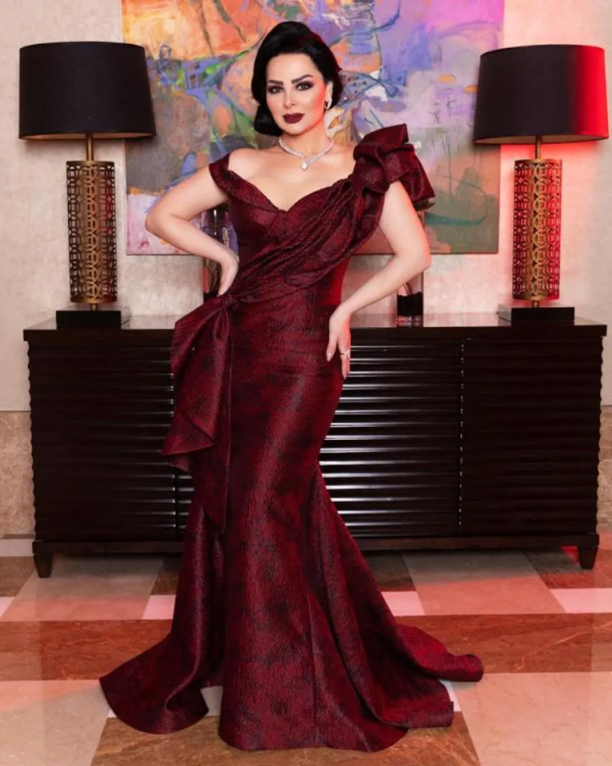 فستان باللون العنابي اختارته ديانا كرزون لإحدى المناسبات: