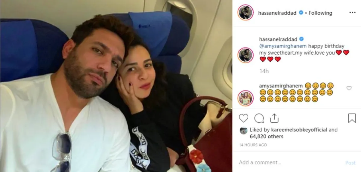 حسن الرداد زوج إيمي غاب عن الاحتفال، ولكنه أرسل لها التهنئة عبر حسابه بموقع إنستقرام، بنشر صورة لهما علق عليها قائلا: كل عام وانت بخير حبيبة قلبي وزوجتي..بحبك، وردت عليه ايمي بايقونات متعددة لفتاة سعيدة وخجولة.