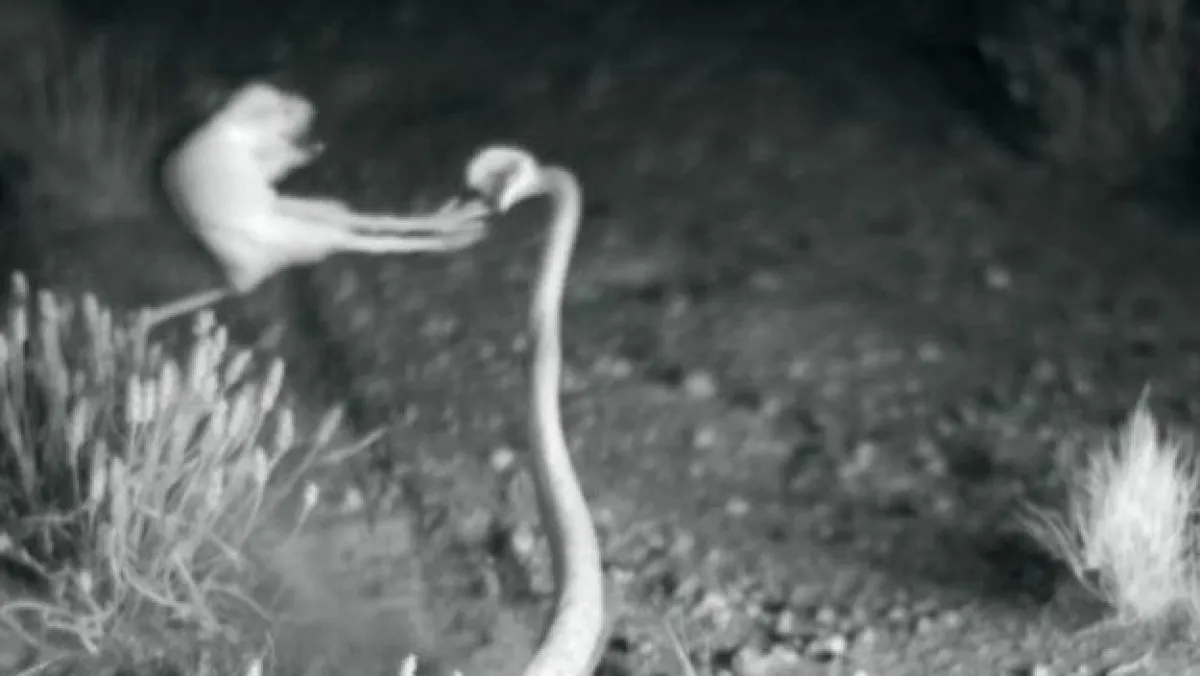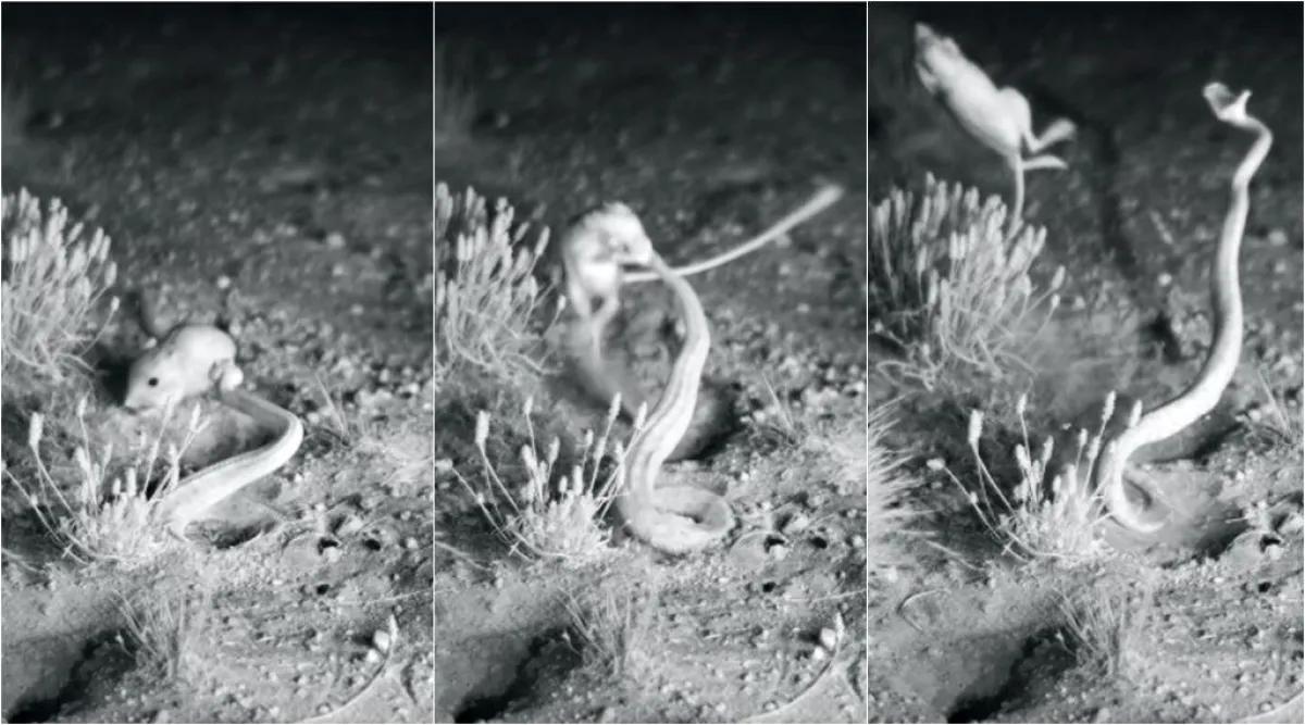 ووفقاً لما ذكره موقع «روسيا اليوم»، فإن مقطع الفيديو يظهر لقطات مذهلة للغاية، للحظة هروب فــأر صحراوي صغير من فصيلة تسمى «فأر الكنغر»، وهو يقفز برشاقة كبيرة للغاية من بين أنياب إحدى الأفاعي «المجلجلة» القاتلة والسامّة، التي كانت تترصد له للنيل منه وتناوله. حيث قفز الفأر بحركة دفاعية مدهشة وكأنه أحد مقاتلي الـ«نينجا».