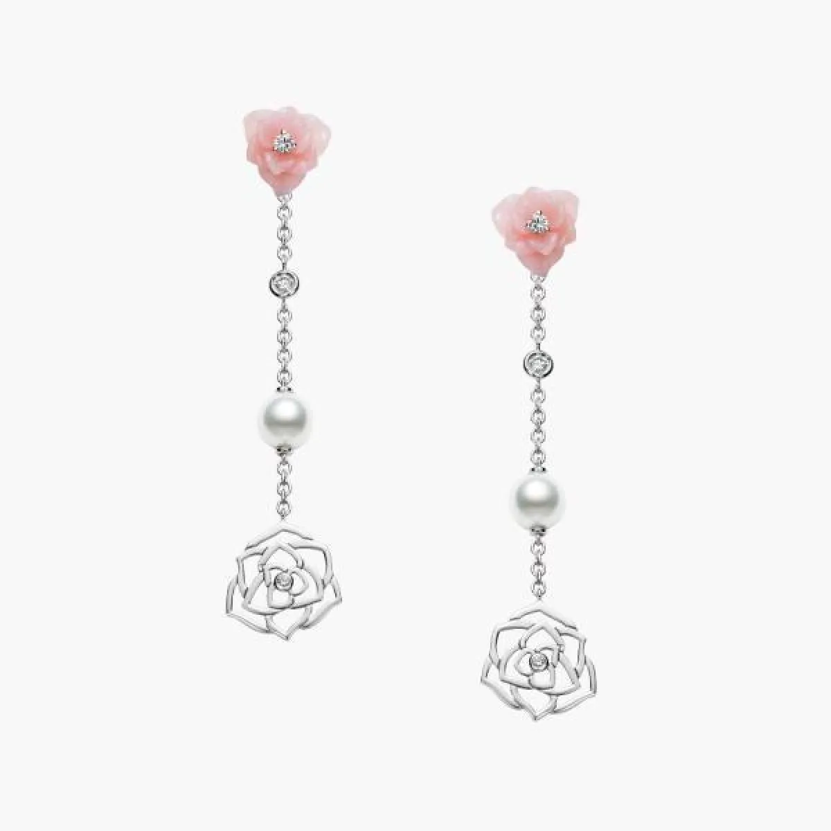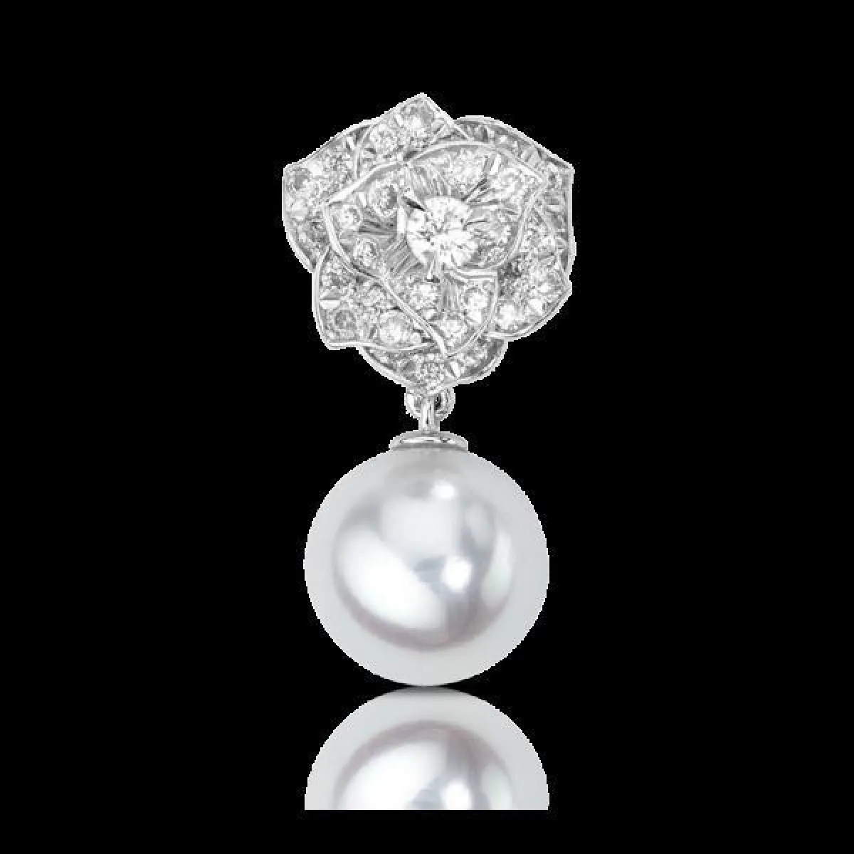 ويمكن أن يتناغم اللؤلؤ مع الذهب الأصفر أيضاً، مثل أقراط الوردة الماسية التي يتدلى منها حبّة لؤلؤ من توقيع ماركة فان كليف آند آربلز VAN CLEEF & ARPELS.