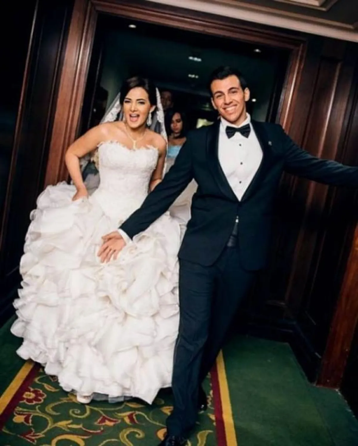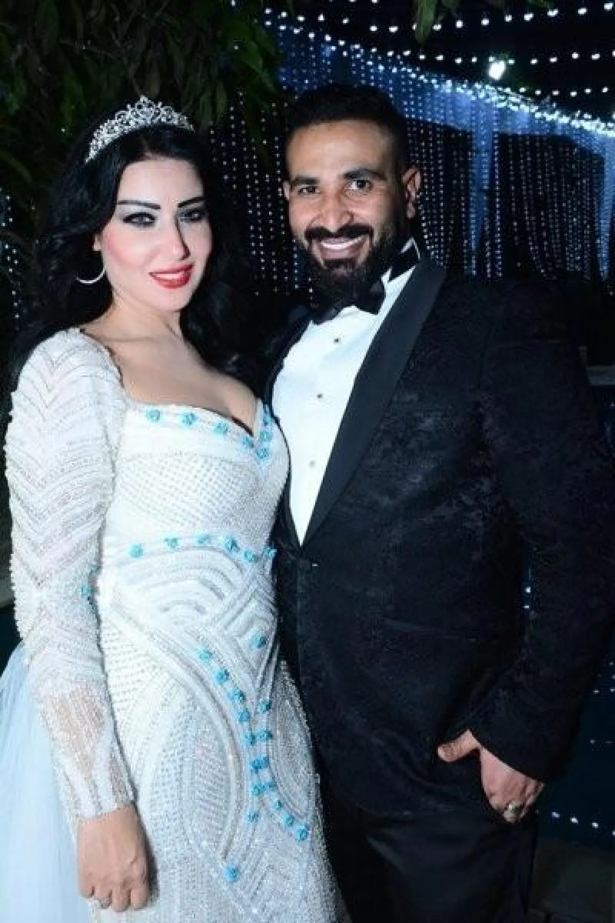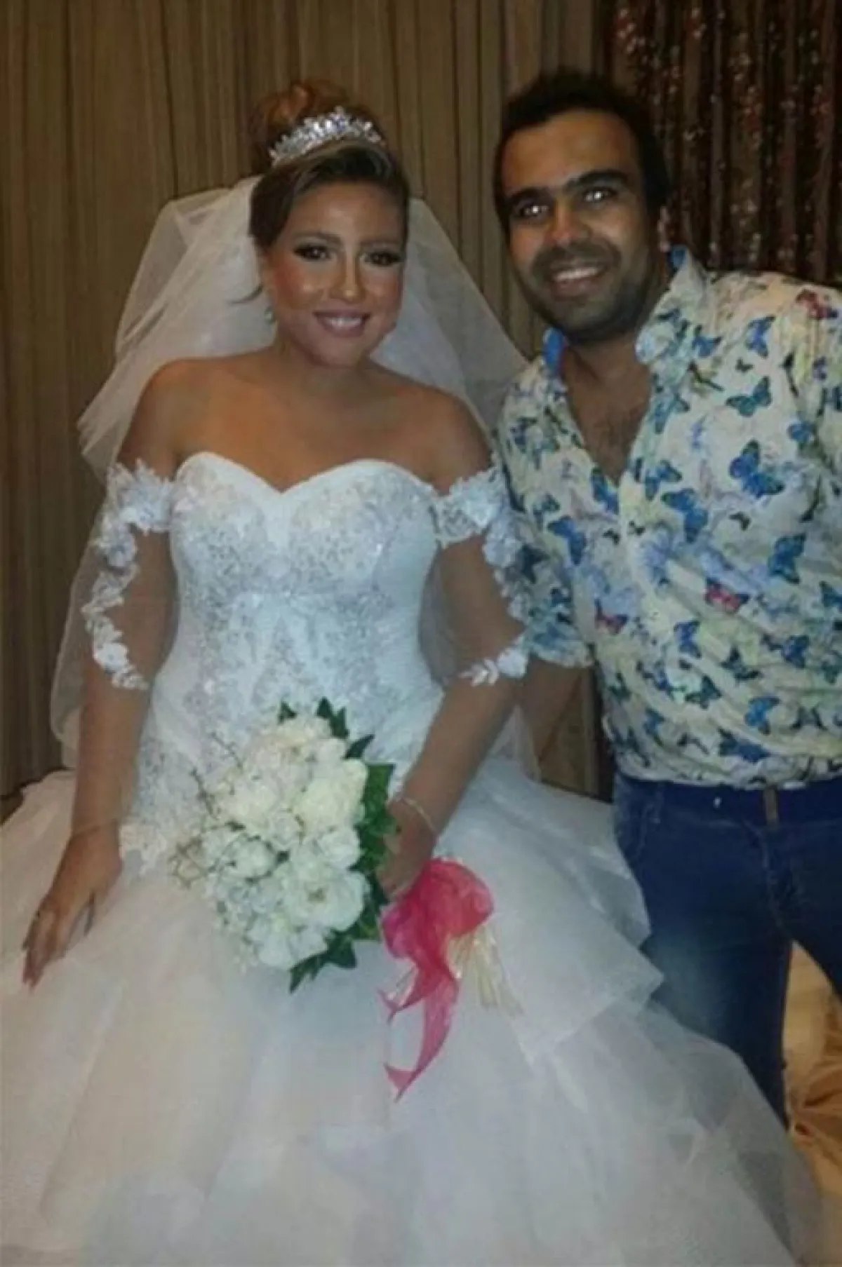 النجمة بلقيس فتحي بدت غريبة بـ فستان زفافها بسبب أكمامه والتاج الغير مناسب لإطلالتها مع فستان زفافها.