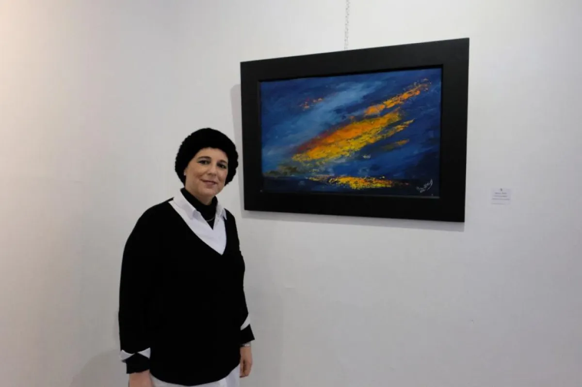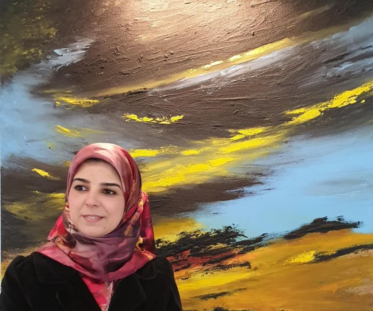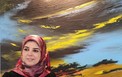 نسرين الشودري مع إحدى لوحاتها