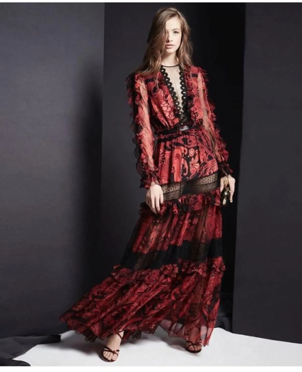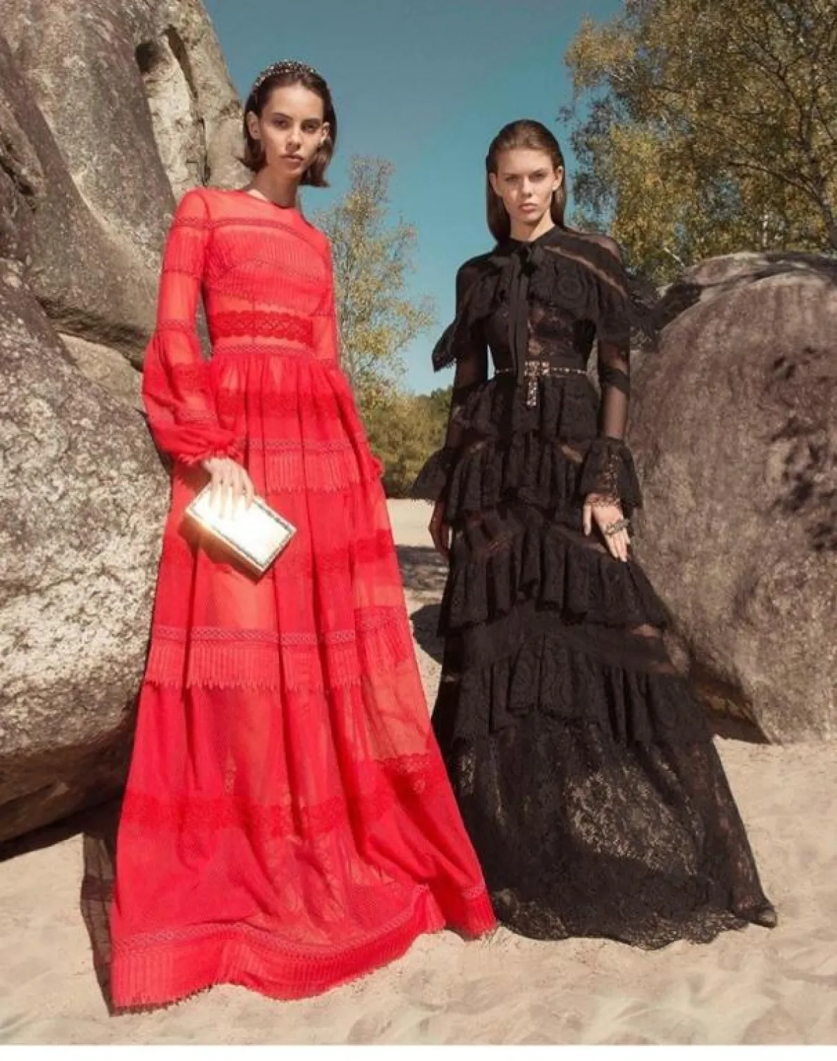 بهذا الربيع سوف تحتاجين لسهرتكِ فساتين كلها حيوية وبهجة، كهذا الموديل الملون والمطبع بالورود، لن تغيّري فيه الكثير، فبأكمام طويلة وتطريزات من الدانتيل الناعمة، نسقيه مع شوز ملونة كالفوشي مثلًا، وحجاب أسود، أو أحد ألوان النود، أو الأبيض سيكون مميزًا.