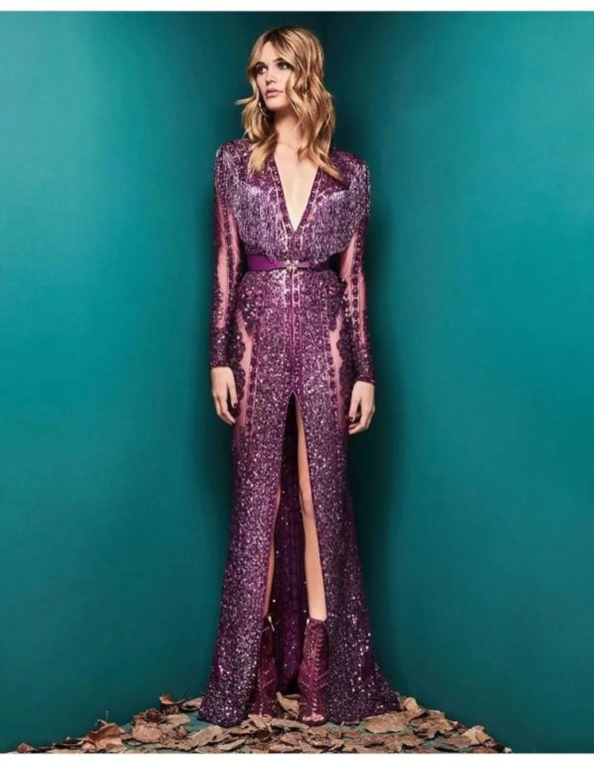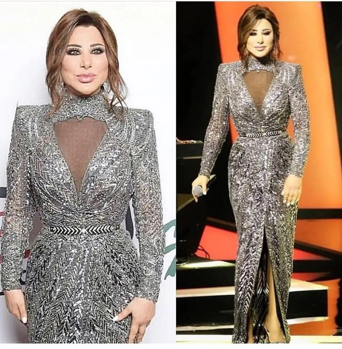 هذا الفستان اللامع مع الخرز الفضي الذي ارتدته النجمة أحلام من زهير مراد، مع الأكمام الطويلة وحزام الخصر، مثالي للصبيّة المحجبة، فقط سوف تعتمدين بطانة لتغطي الفتحات الشفافة عند منطقة الصدر والأكمام، كما أنّ التطريزات التي جاءت بشكل طولي، سوف تُبرز جمالكِ وطولِك، وحزام الخصر الذي يُعتبر طابعًا أساسيًّا بالكثير من تصاميم زهير مراد، سوف يُبرز جمال خصرِك، نسقيه مع حجاب باللون الأسود الليلكي، وحذاء فضي أو أسود، أما الكلتش فلا تختاريه ملون، يفضل أيضًا أن يكون من لون الفستان نفسه ليُبرز جمالكِ.