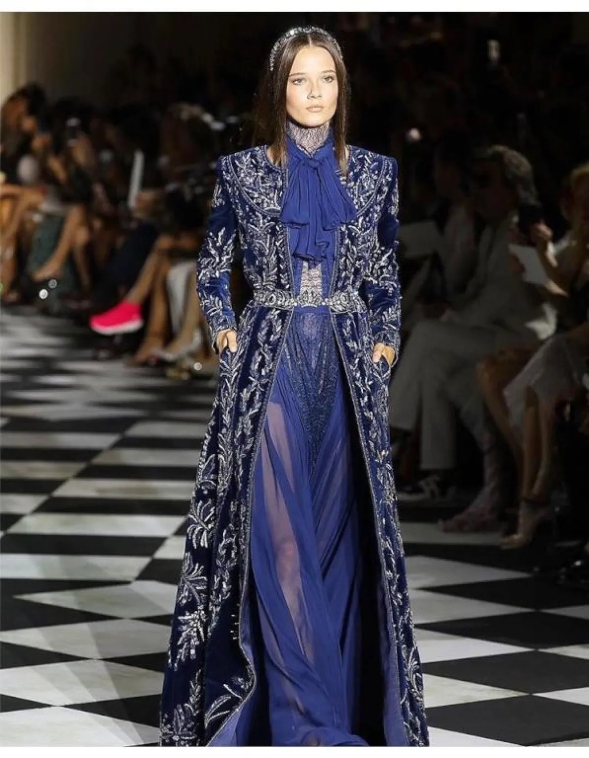 هذا التصميم للفستان المفتوح المخملي باللون الأزرق الليلكي، مع الطراز العربي، سيكون مناسبًا لحفلاتكِ ومناسباتِك، بخاصة التي تحمل الطابع العربي والثقافي، كالحفلات الرسمية، لكنكِ ستحتاجين لبطانة مع البنطلون الشفاف، نسقيه مع حجاب باللون نفسه لاطلالة حيادية، أو مع أبيض ناعم.
