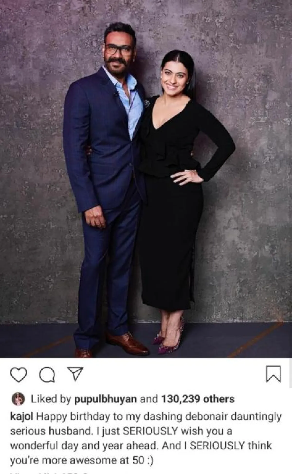 بدورها نشرت النجمة كاجول Kajol زوجة أجاي، على حسابها الخاص في انستقرام، صورة معه معلقةً عليها بالقول: "عام سعيد لزوجي الرائع، أتمنى لك حقًّا يومًا رائعًا وحياةً سعيدة إلى الأمام، وأعتقد فعلًا أنك تزداد وسامةً على عمر الخمسين."