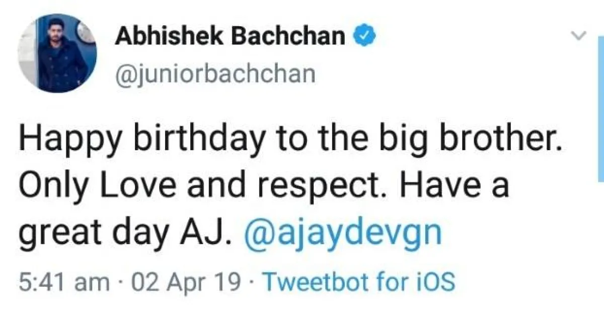 أبهيشيك باتشان Abhishek Bachchan غرّد على تويتر معايدًا أفجان بالقول: "عيد ميلاد سعيد إلى أخي الكبير، الكثير من الحب والاحترام، أتمنى لك نهارًا سعيدًا."