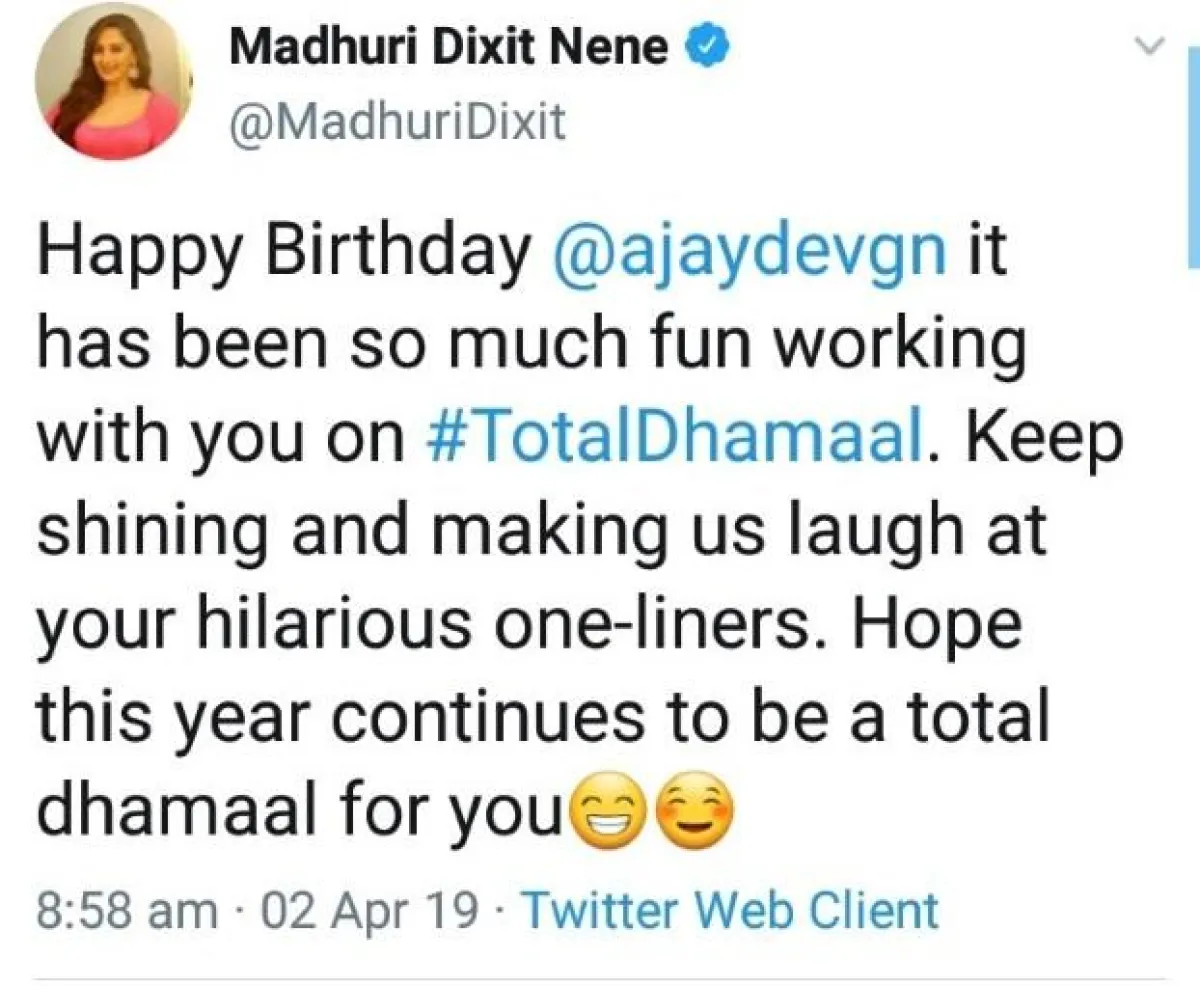 النجمة مادهوري ديكسيت Madhuri Dixit عايدت صديقها ديفجان على تويتر بتغريدة قالت فيها: "كل عام وأنت بخير أجاي، وكان لي وقت ممتع في العمل برفقتك، كن دائمًا مرحًا في عملك وحياتك كما عوّدتنا، وأتمنى ان يكون هذا العام أفضلك لك من غيره."