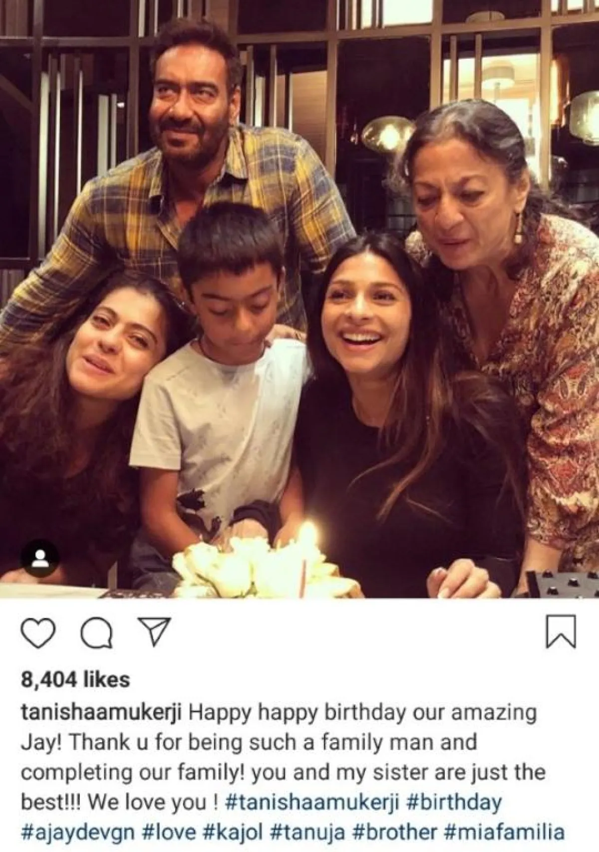 كما نشرت تانيا شقيقة كاجول صورة على انستقرام، تظهر فيها مع أجاي وشقيقته ووالدتها، وابن شقيقتها، وعلقت عليها بالقول: "كل عام وأنت بخير العظيم أجاي، شكرًا لك لأنك فرد من هذه العائلة وجزء منها، أنت وشقيقتي الأفضل بالنسبة لنا، ونحن نحبك كثيرًا."