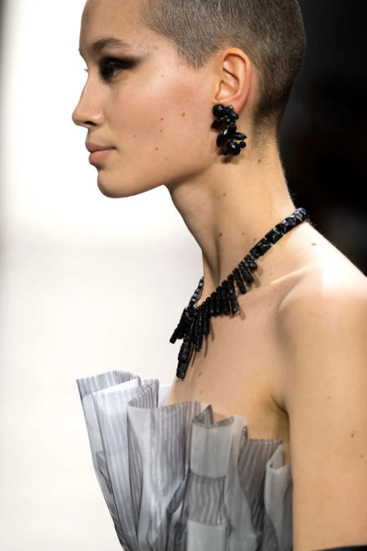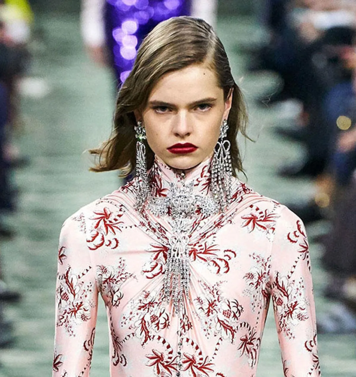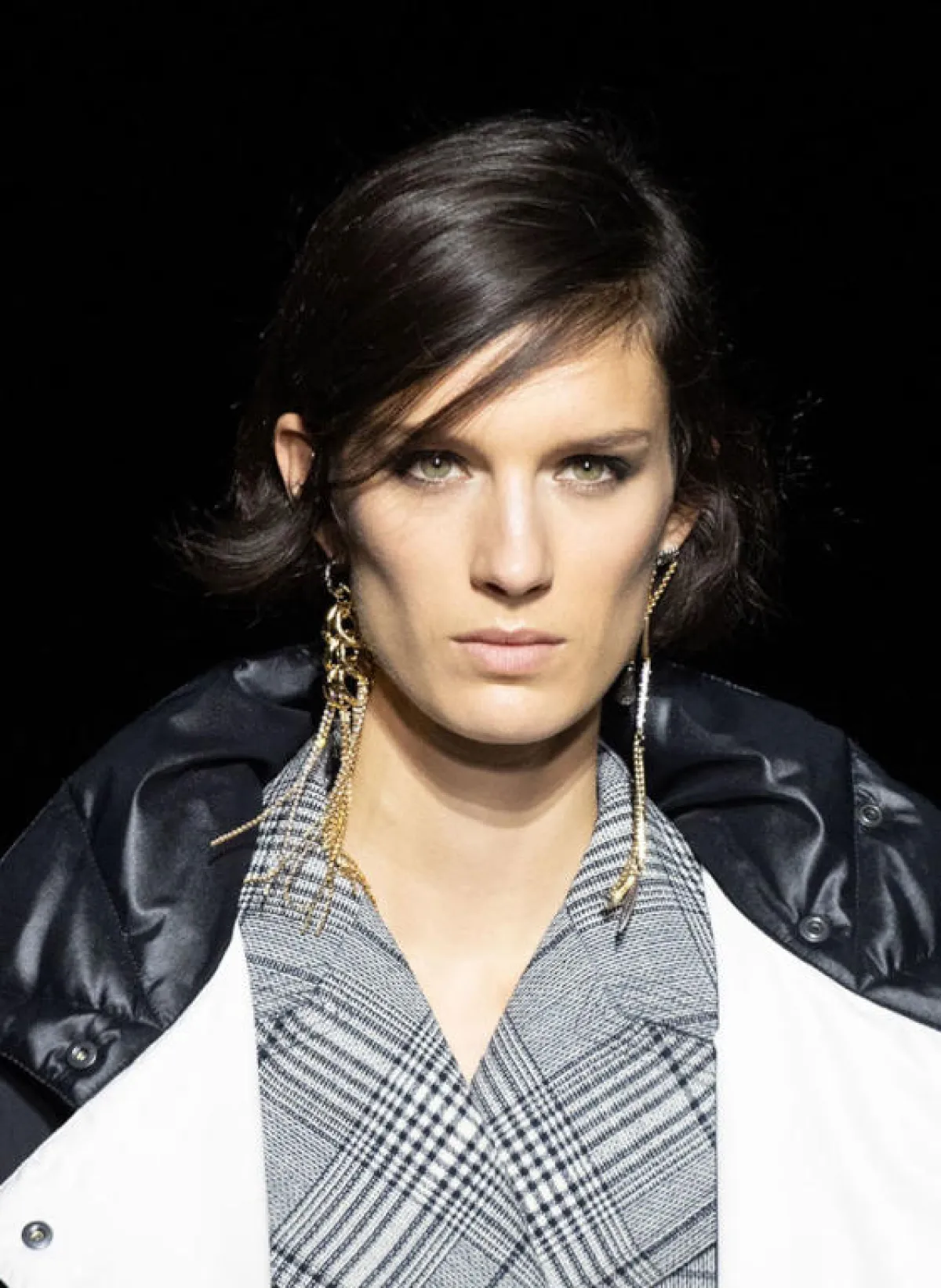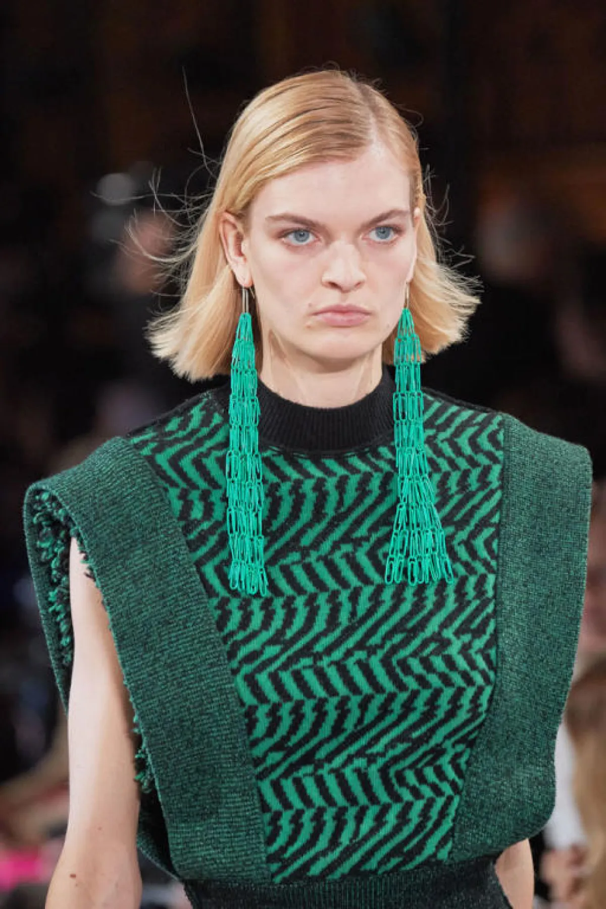 عادت مرة أخرى الأقراط الطويلة التي تتخطى الأكتاف، ربما بسنتيمترات عدة. قدمت دار فالنتينو Valentino زوجًا من الأقراط الذهبية، انتهت بحجر باللون الأحمر الناري، أما دار ستيلا مكارتني Stella McCartney فقدمت زوجًا من الأقراط الفيروزية التي امتدت إلى ما بعد الكتف.